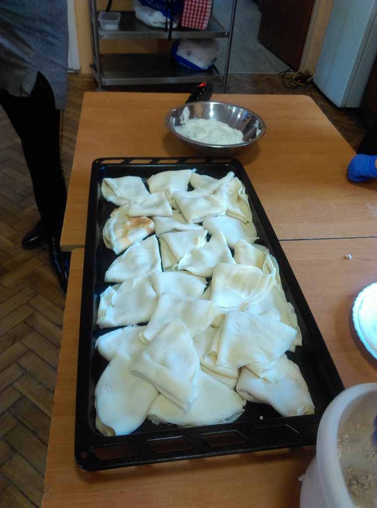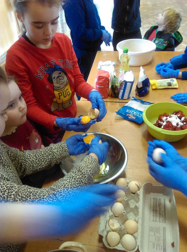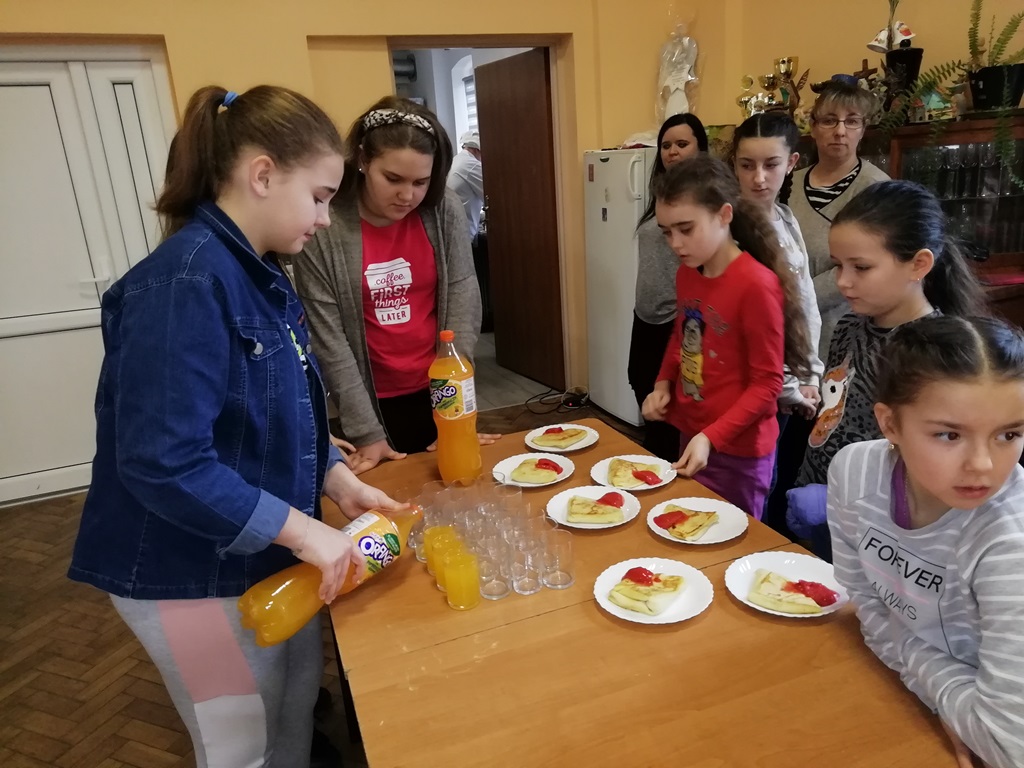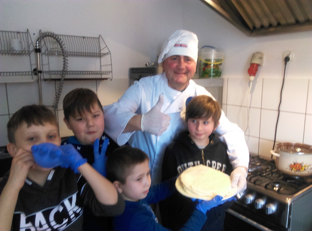 Po takim początku, przystąpiliśmy do pracy. Uczestnicy zostali podzieleni na grupy, aby każdy miał coś do powiedzenia przy robieniu naleśników na słodko. Młodzi adepci radzili sobie różnie. Najpierw każdy chciał dużo… Potem nastąpiło zmęczenie materiału… Przy animacjach kulinarnych pozostali tylko ci, którzy chcieli się czegoś nauczyć.
