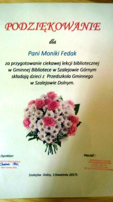 11 kwietnia 2017 roku filię biblioteczną w Szalejowie Górnym odwiedziły przedszkolaki, które przyjechały z okolicznego Szalejowa Dolnego. Celem głównym wizyty było zapoznanie dzieci z biblioteką i pracą bibliotekarza, a także rozbudzanie zainteresowań czytelniczych wśród dzieci. Pani bibliotekarka Monika zapoznała młodych czytelników z zasadami zachowania się w bibliotece i mówiła o tym, jak dbać o wypożyczone książki. Wszystkim dzieciom bardzo spodobały się kolorowe i bogato ilustrowane książki, które z chęcią oglądały i komentowały oglądane obrazki. Kolejnym etapem spotkania były zabawy w zgaduj zgadula - jaka to książka?