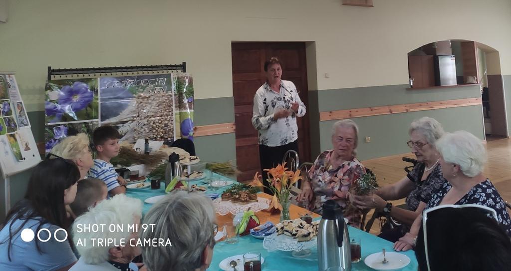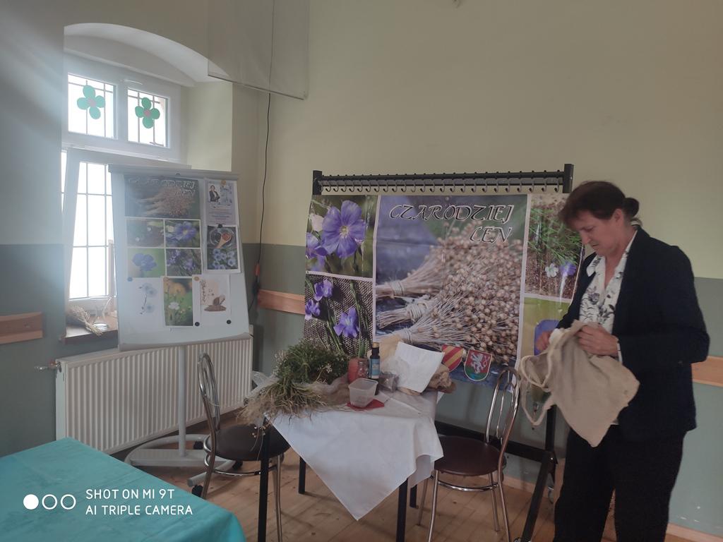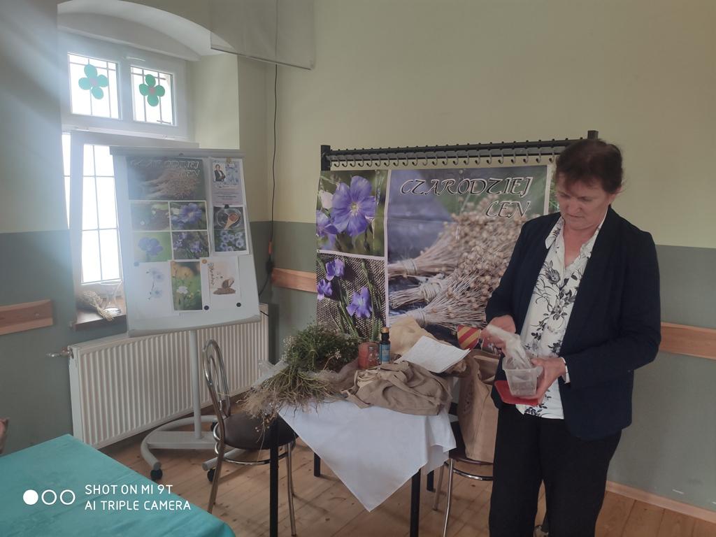 -„Len to roślina niezwykła – piękna, delikatna, a jednocześnie silna i wszechstronna” – mówiła pani Urszula, prezentując lniane tkaniny, olej lniany i suszone kwiaty. Uczestnicy mogli dotknąć materiałów, powąchać lniane nasiona i poznać ich zastosowanie w medycynie ludowej. Prelegentka podkreślała, że len był nie tylko źródłem ubioru, ale też lekarstwem – stosowany na problemy trawienne, skórne, a nawet jako środek uspokajający.