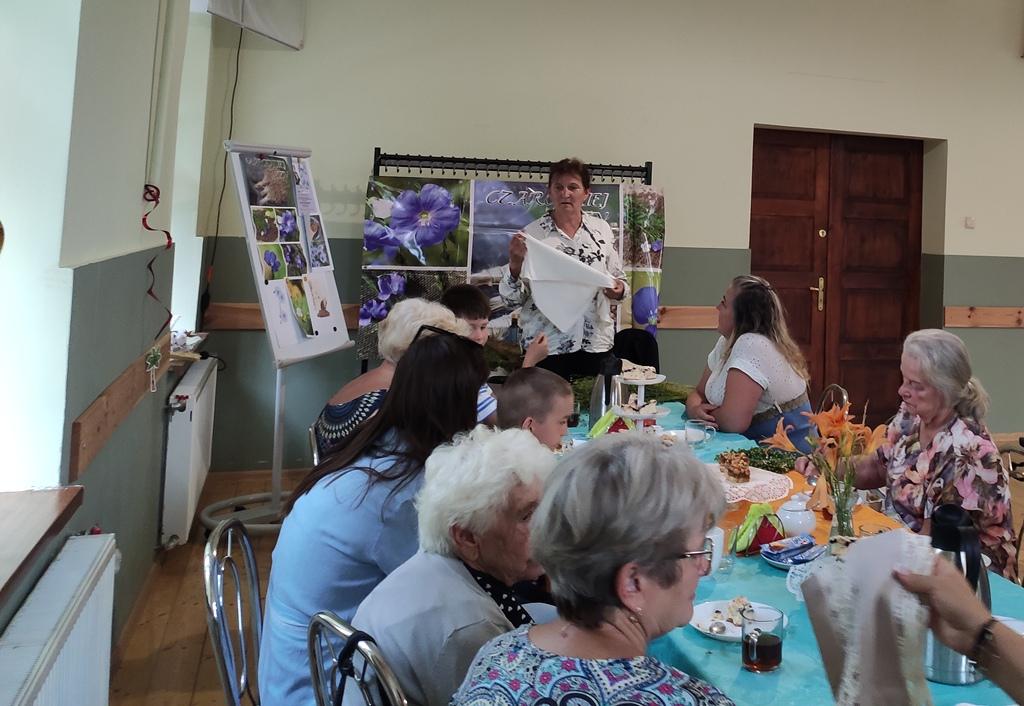 W okresie trwającego jeszcze lata, Filia Biblioteki Publicznej Gminy Kłodzko w Wojciechowicach zamieniła się w miejsce pełne wspomnień, zapachów i opowieści o dawnych tradycjach lniarskich. Gościem specjalnym spotkania była pani Urszula Borkowska, pasjonatka historii lokalnej i znawczyni właściwości lnu, która z niezwykłą swadą przeniosła uczestników w czasy, gdy len był nie tylko podstawą życia codziennego, ale też źródłem zdrowia i piękna.