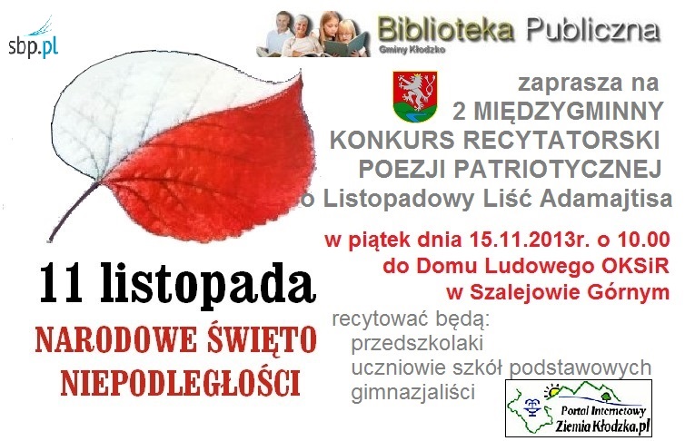 W tegorocznej edycji konkursu, który odbył się w Szalejowie Górnym udział wzięło 75 osób w trzech kategoriach wiekowych \w roku ubiegłym 37\ . Uczestnicy przyjechali z miasta i gminy Kłodzko, gmin Bystrzyca Kłodzka, Lewin Kłodzki i Duszniki Zdrój. Gościem specjalnym był Radny Powiatu Kłodzkiego pan Lubomir Danielczyk, kierownik Biura Powiatowego ARiMR w Kłodzku. Wszystkich gości u uczestników powitała pani Mariola Huzar – dyrektor Biblioteki Publicznej Gminy Kłodzko, która poprowadziła konkurs z okazji Święta Niepodległości. Poziom recytacji był na różnych poziomach, ale u wszystkich odczuwalna była duża miłość do ziemi ojczystej.