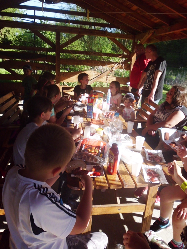 Na zakończenie wycieczki zostaliśmy poczęstowani pysznym wafelkiem z miodem. Po "lekcji" w pasiece, dzięki uprzejmości gospodarzy "Siedliska", razem zasiedliśmy do grillowania.