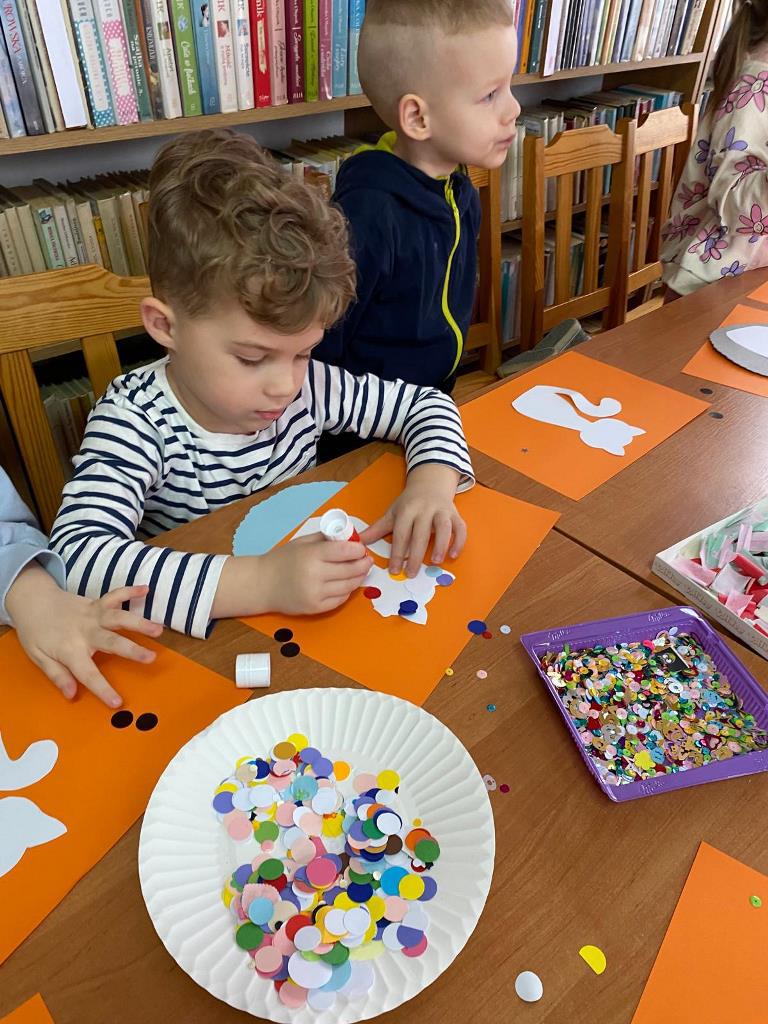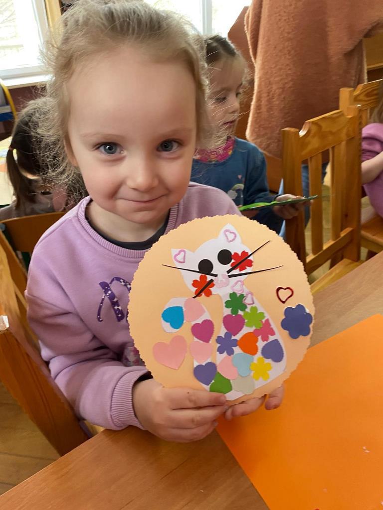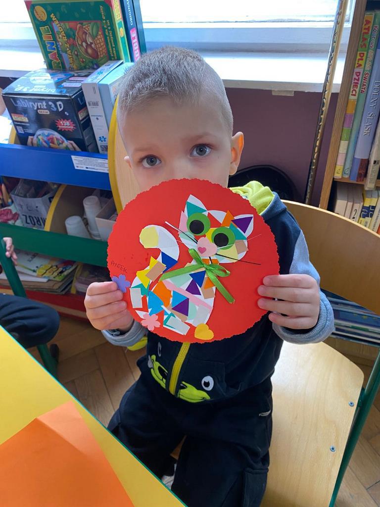 Po rozmowie o kocich zwyczajach, nasi goście przystąpili do wykonania mozaikowego kotka. Było to trudne zadanie, wymagające dużego skupienia, wyobraźni, cierpliwości. Mozaika rozwija twórcze umiejętności. Z różnych elementów, takich jak kółka, paski, trójkąty, prostokąty, kwiaty, kamienie, szkło - można komponować wiele wzorów. Jest to forma sztuki, w której powierzchnia jest pokryta małymi kawałkami różnych materiałów, które ściśle do siebie pasują. Ułożone pod względem koloru, kształtu i rozmiaru tworzą niesamowite wzory. I taki miał być nasz kotek!