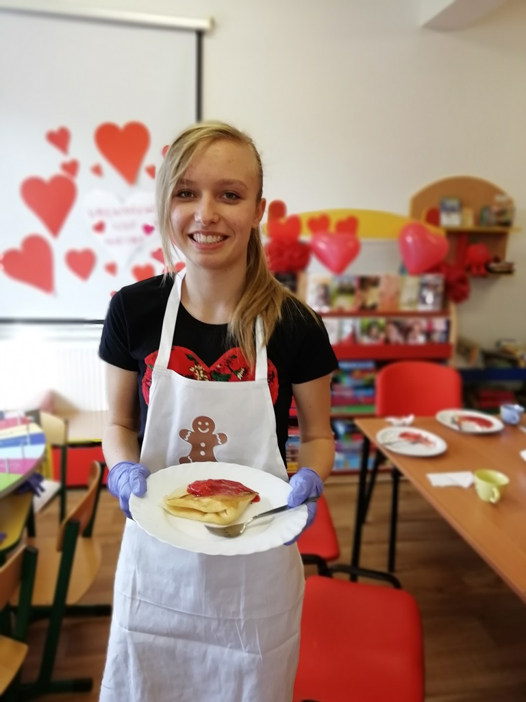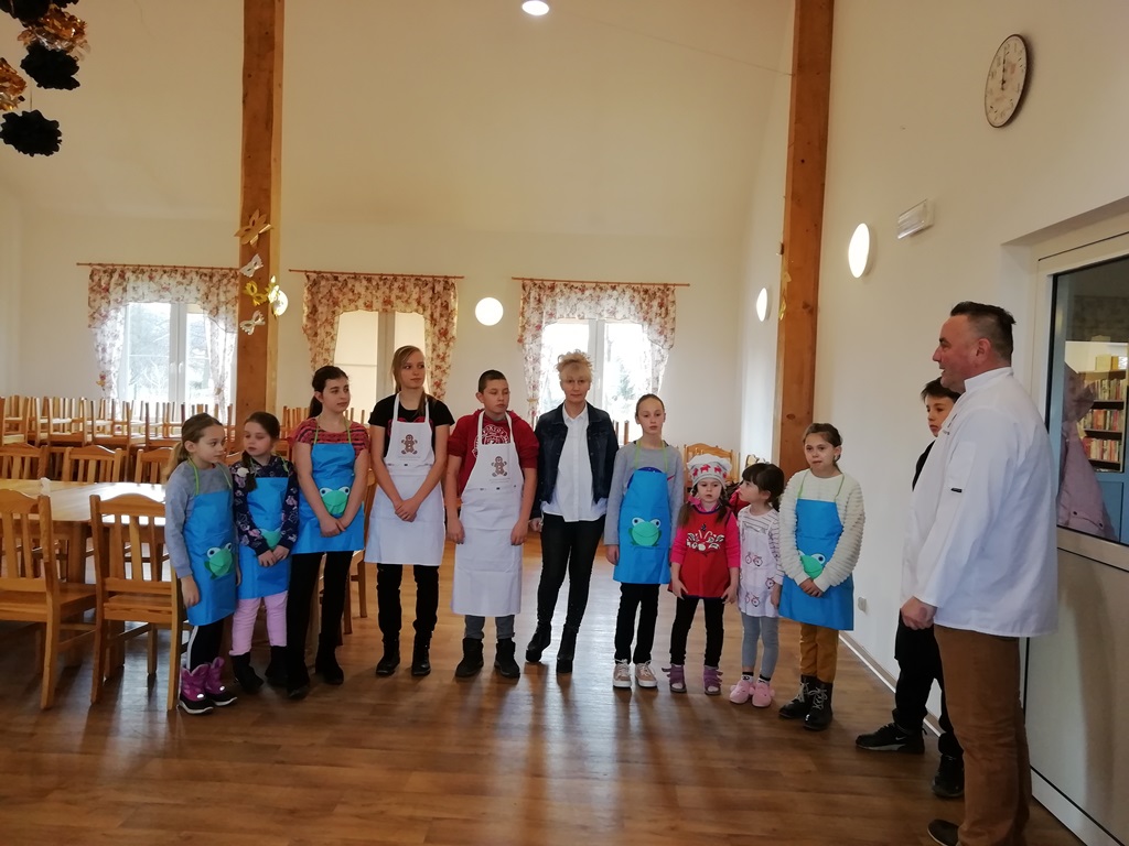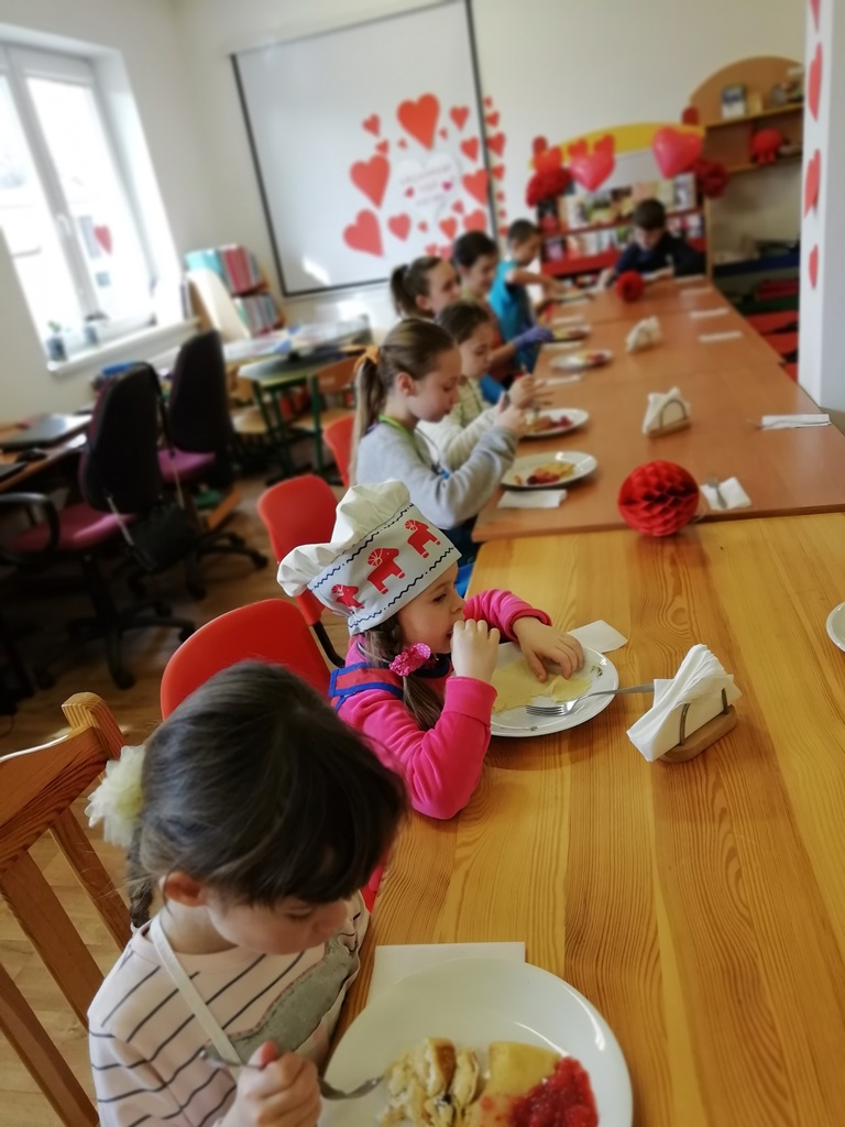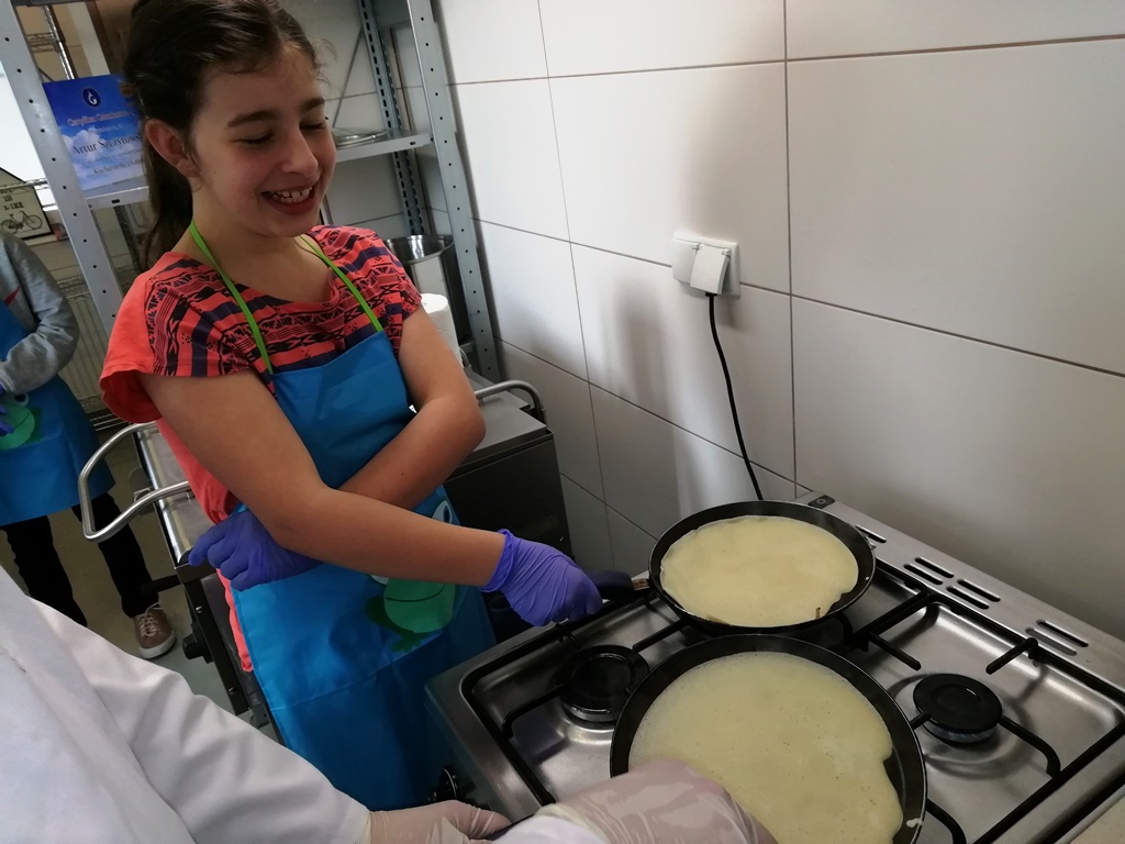 Dzieci i młodzież szkolna po zapoznaniu się z certyfikowanym kucharzem, pełni dobrych chęci poznania tajemnic naleśnikowych zabrali się do pracy. Jak widać na załączonych obrazkach, mali i duzi kucharze wyglądali profesjonalnie.