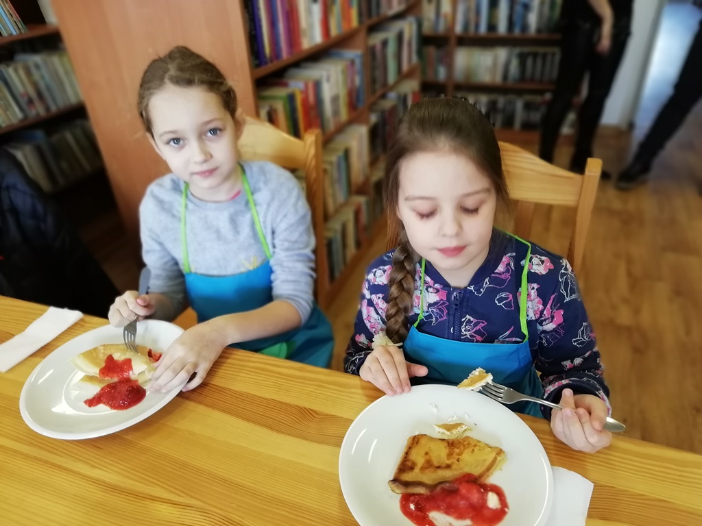 Zajęcia kulinarne zupełnie wciągnęły młodych uczestników. Podczas warsztatów największym zainteresowaniem cieszyło się przygotowanie ciasta naleśnikowego oraz przygotowanie musu owocowego. Co niektórzy, podczas smażenia odważyli się na tzw. podrzucanie placków. Najmłodszym pomagała pani bibliotekarka Ewa, która też nieźle gotuje.
