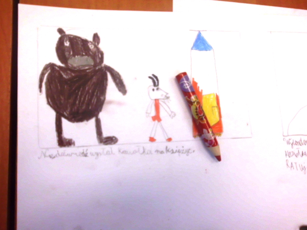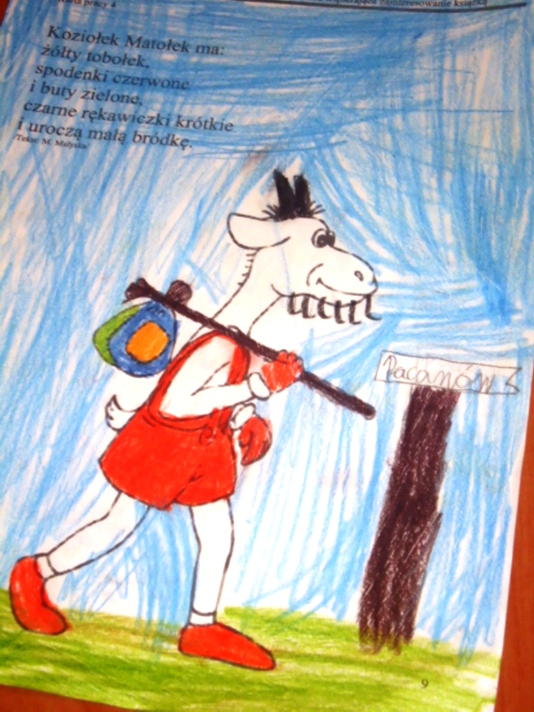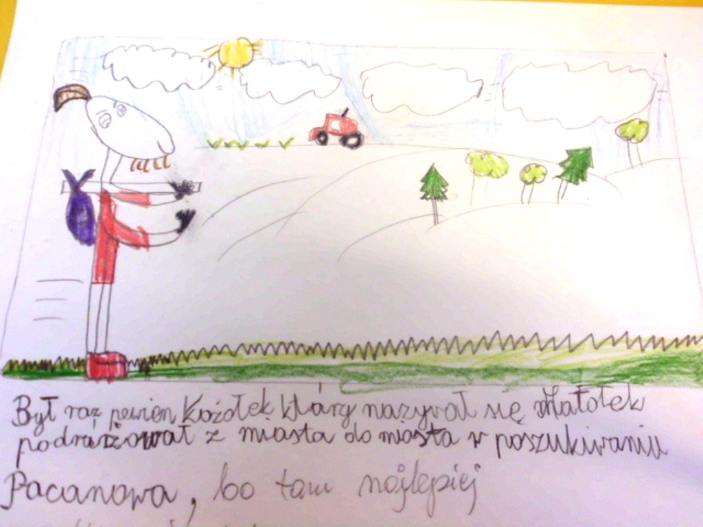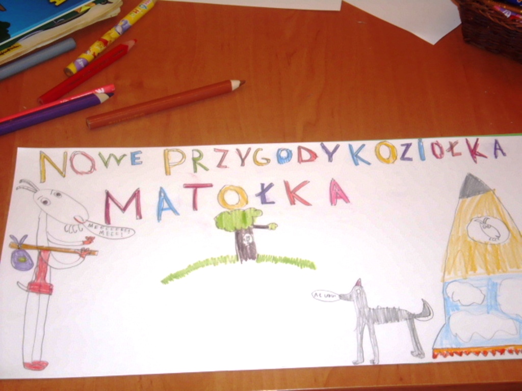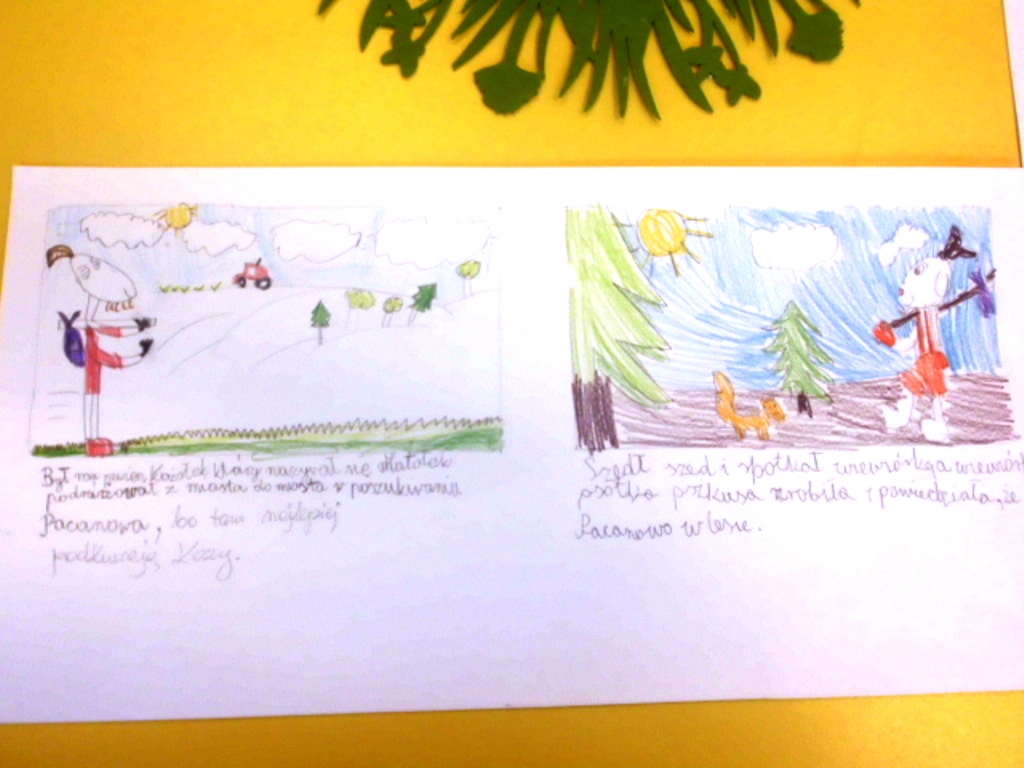 Tak nastrojone dzieci, przystąpiły do wyćwiczenia rąk w sprawnym rysowaniu koziołka i nie tylko… No, i się zaczęła z pozoru łatwa praca. Szybko jednak okazało się, że to nie takie proste. Wymyślić tekst, napisać go i narysować. Trzeba było uruchomić wyobraźnię i koncentrację, a następnie wyczarować bohatera bajki;