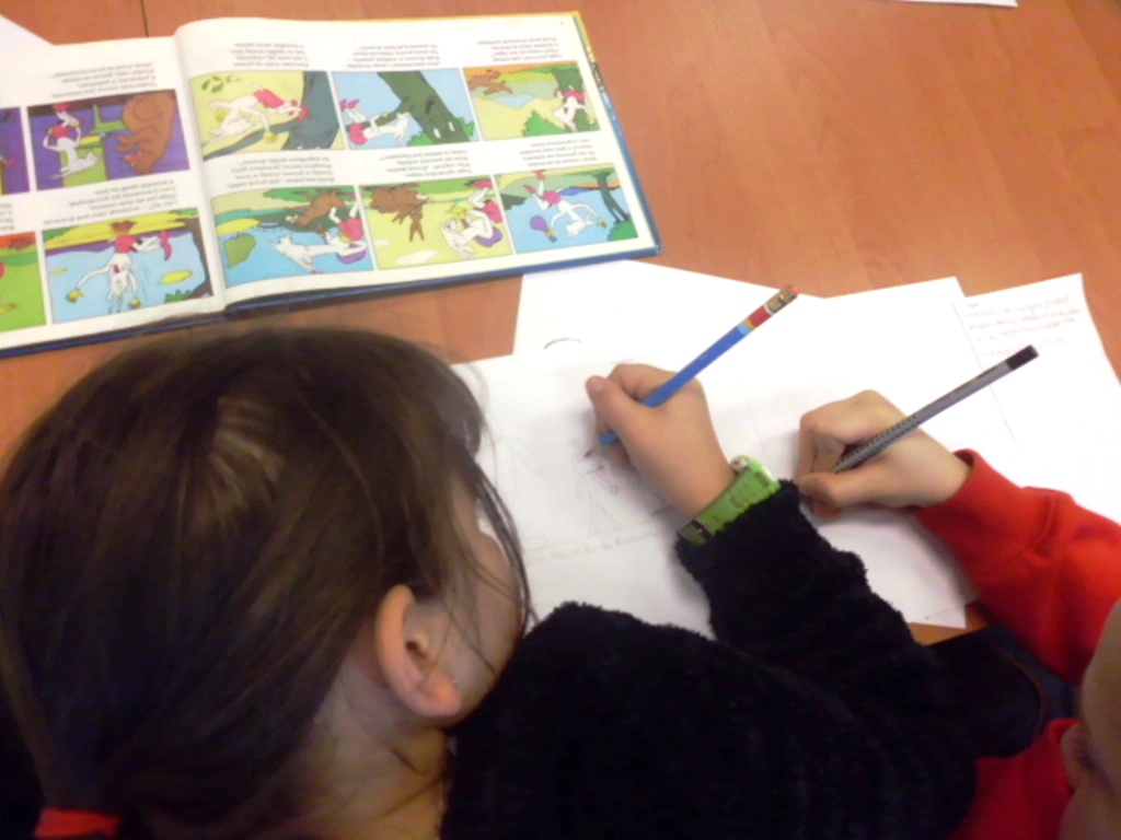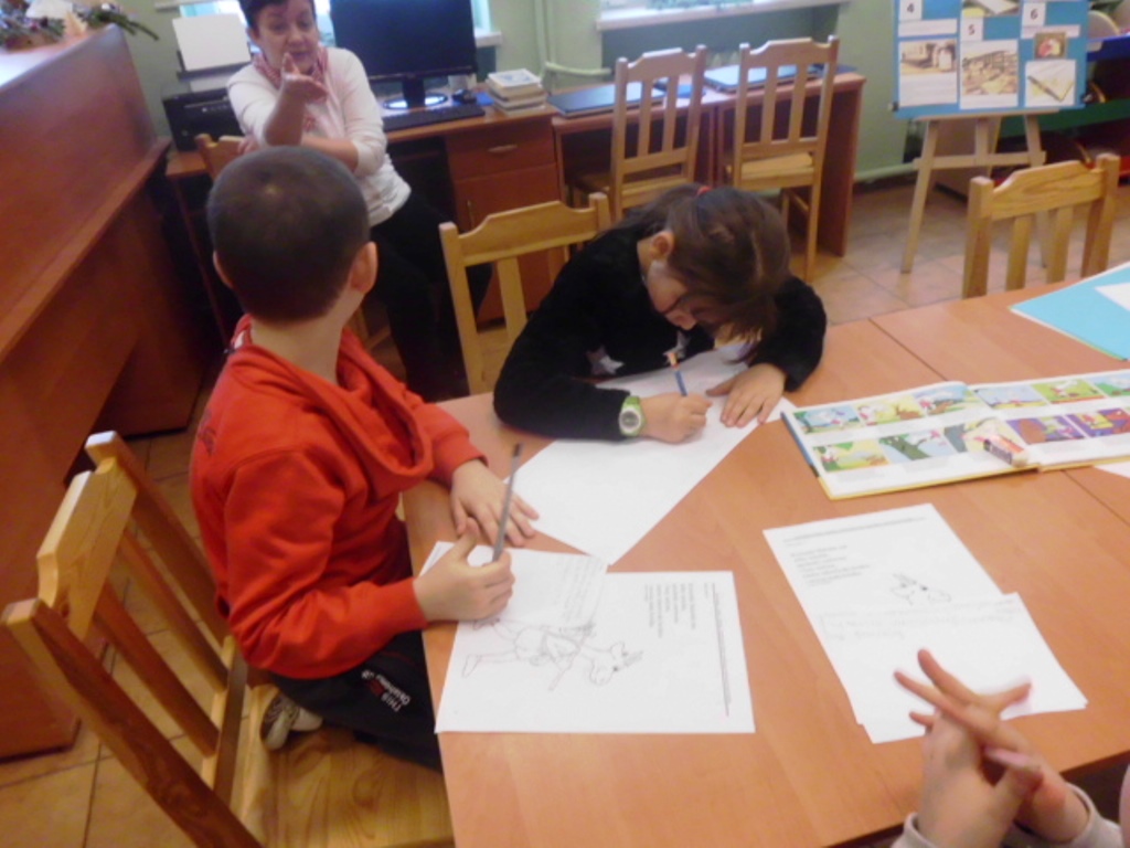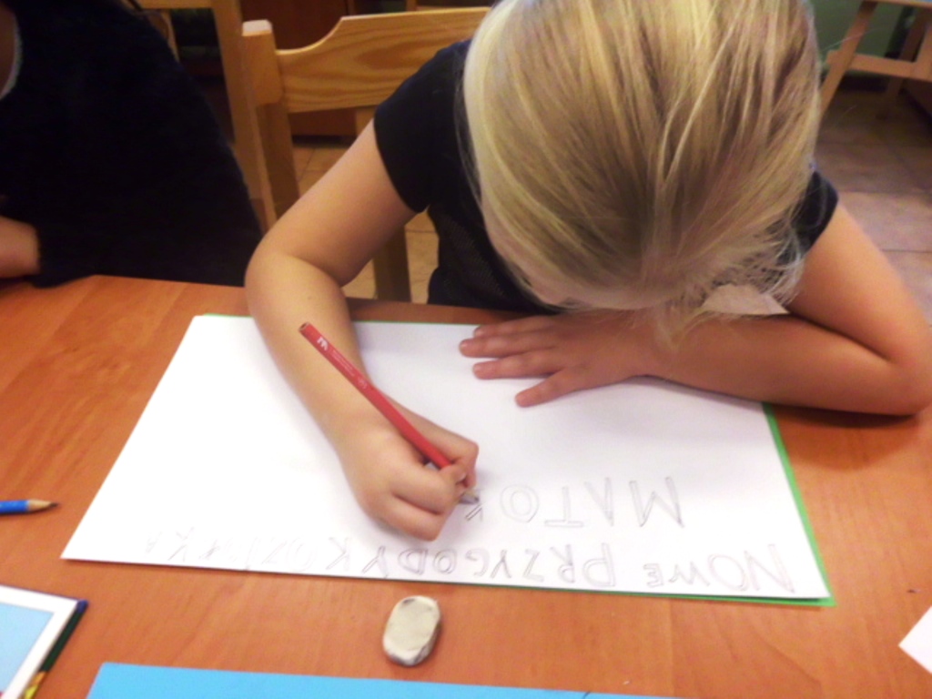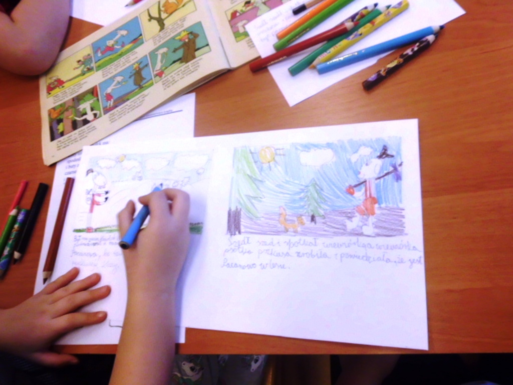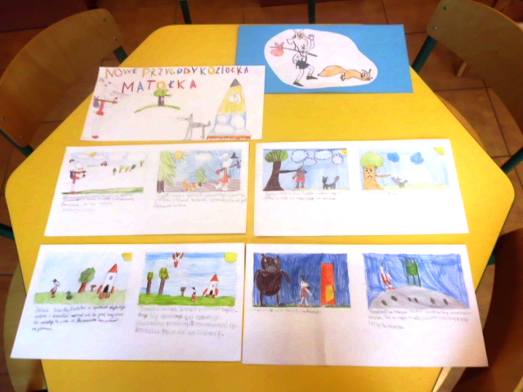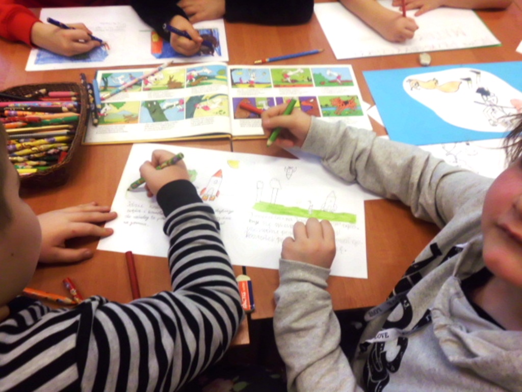 Tak nastrojone dzieci, przystąpiły do wyćwiczenia rąk w sprawnym rysowaniu koziołka i nie tylko… No, i się zaczęła z pozoru łatwa praca. Szybko jednak okazało się, że to nie takie proste. Wymyślić tekst, napisać go i narysować. Trzeba było uruchomić wyobraźnię i koncentrację, a następnie wyczarować bohatera bajki;