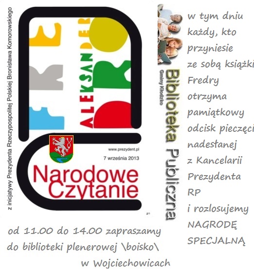 W gminie Kłodzko, przyjeżdżając do Wojciechowic można było zasiąść w kameralnej bibliotece plenerowej na miejscowym boisku i wsłuchać się w treści różnych tekstów Aleksandra Fredry. Pogoda dopisała i miłośnicy książek także. Atrakcją spotkania była nadesłana z kancelarii Prezydenta RP okolicznościowa pieczęć, która została odciśnięta na wszystkich egzemplarzach książek Fredry przyniesionych przez uczestników.