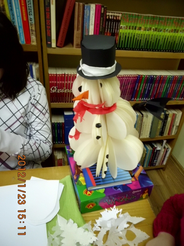 Pani Roma Szczerbień – prowadząca zajęcia – odkryła jedną ze swoich tajemnic, jak zrobić bałwanka jak harmonijka. Oj, ciekawości i pracy było przy nim wiele, ale warto było poczekać na efekt końcowy. Gimnazjalistki pociły się nad tym dziełem sztuki i nie ukrywały, iż swoimi nowymi umiejętnościami podzielą się podczas szkolnych zajęć.