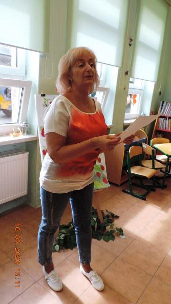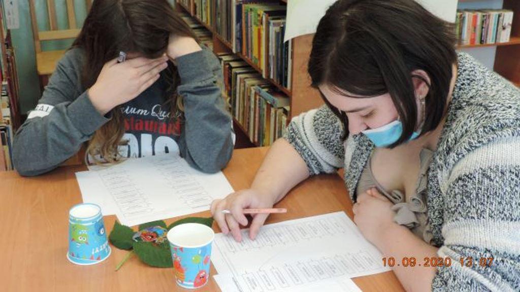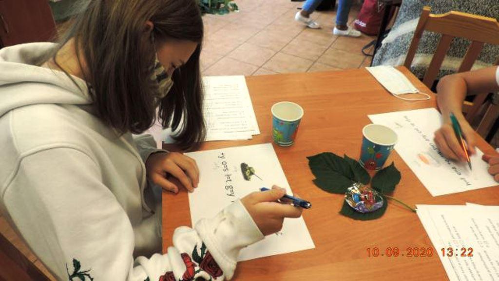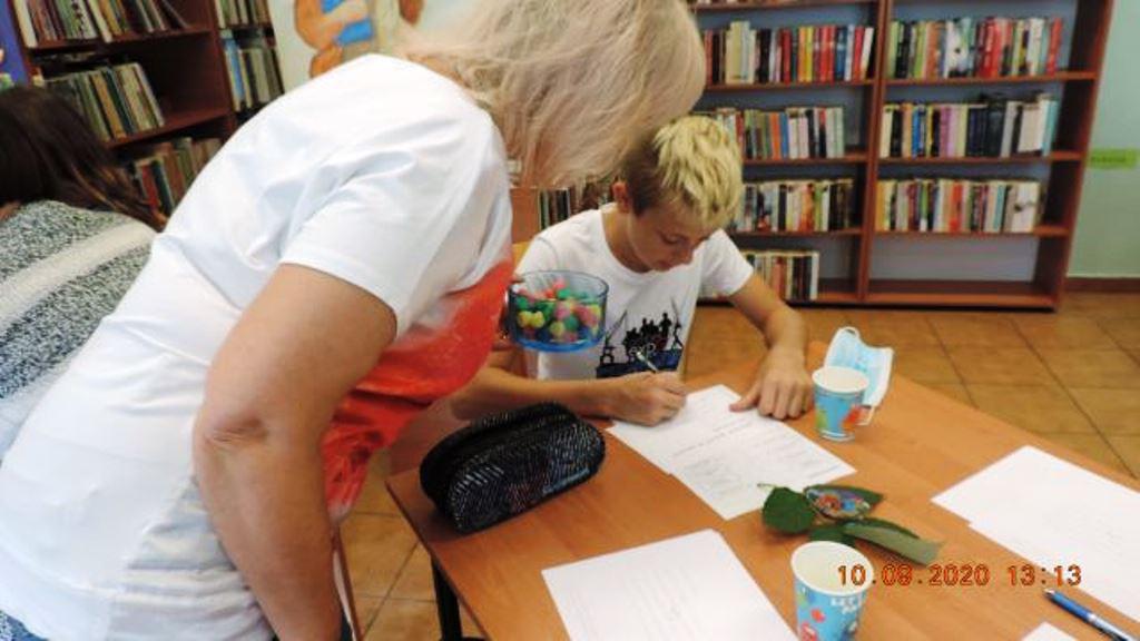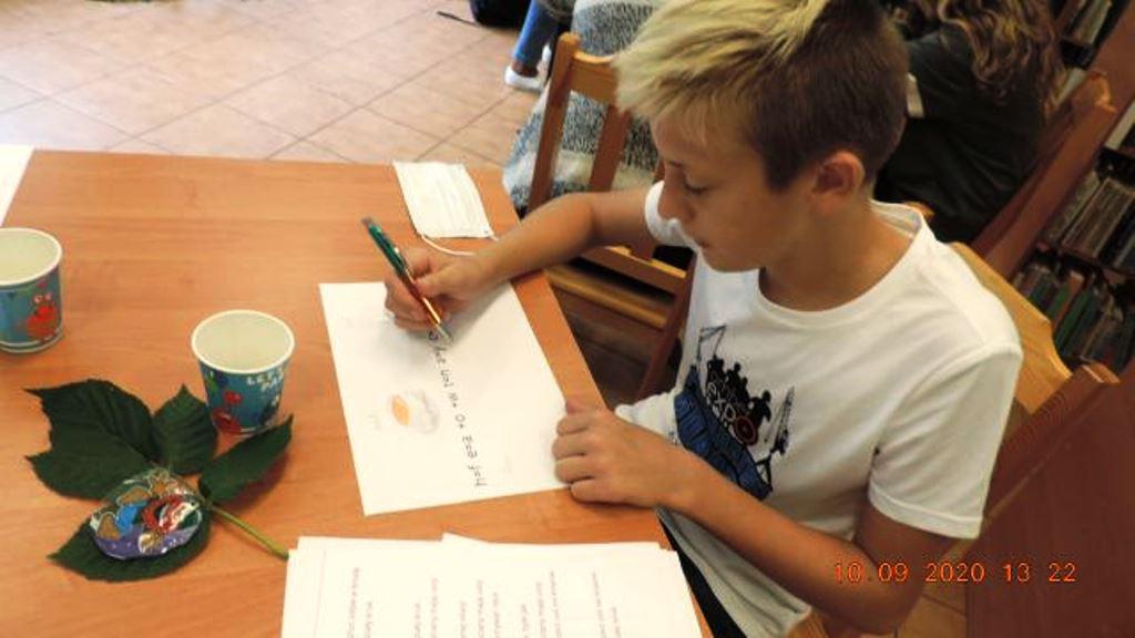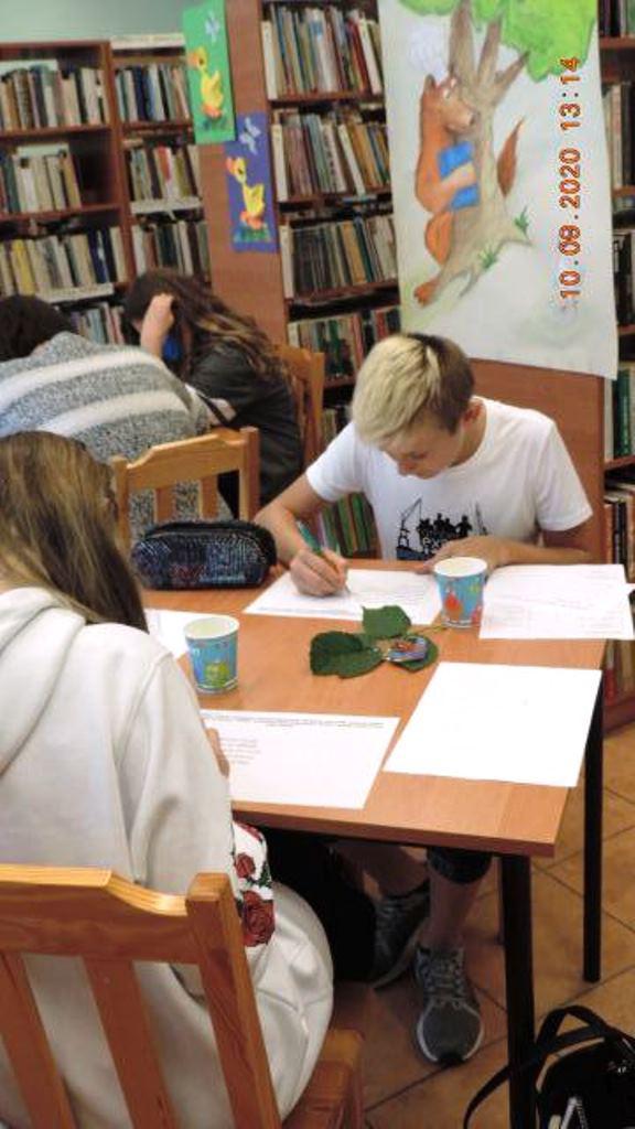 Drugie zadanie wymagało skupienia, aby zapamiętać jak najwięcej synonimów do zwrotu ,, wpuścić kogoś w maliny", czytanych głośno przez panią bibliotekarkę. Po przeczytaniu uczestnicy wypisywali je samodzielnie. Wygrywała ta osoba , która zapamiętała najwięcej.