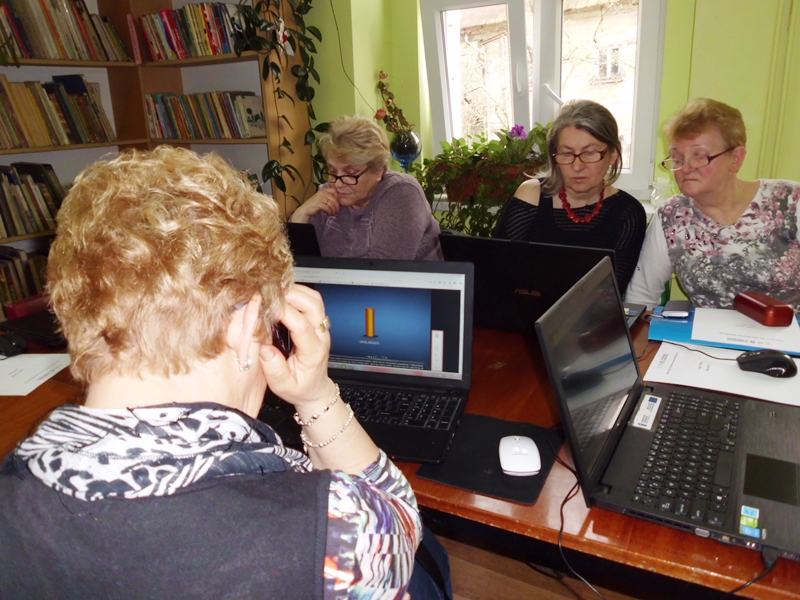 Pierwsza grupa (8 osób) uczestniczy w spotkaniach edukacyjnych na poziomie podstawowym. Każda z osób ma indywidualny dostęp do komputera i platformy. Nad prawidłowością funkcjonowania sprzętu czuwa informatyk Biblioteki pan Paweł Strycharz.