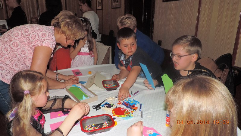 Równocześnie w komnacie kominkowej odbywały się warsztaty plastyczne na zakładki do książek, które prowadziła pani Roma Szczerbień – przyjaciel Biblioteki Publicznej Gminy Kłodzko, przy wsparciu wolontariuszy Ośrodka Kultury, Sportu i Rekreacji.