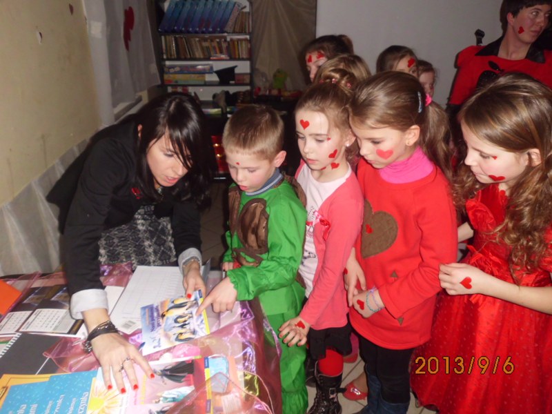 Zajęcia pn. walentynkowe kolorowanki z życzeniami prowadziła pani Bogumiła Płoskonka z biblioteki w Bierkowicach. Powstały piękne wyznania, opatrzone serduszkami i pracą dzieciaczków, które trafiły do sznurkowej galerii i można je będzie oglądać na co dzień. Swoje pięć minut mieli Ci, co zaskoczyli nas swoim wyglądem. To oni rozpoczęli „wyjadanie nagród” z suto nakrytego stołu.