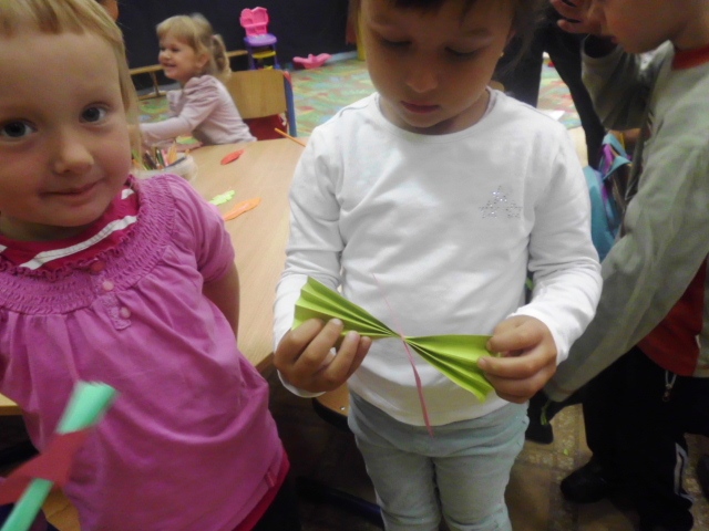 Po różnego rodzaju zabawach edukacyjnych, dzieci nagle odkrywają, że jest coś takiego, jak recykling, który pozwala na drugie życie papieru. Z euforią przystępują do samodzielnych zadań manualnych. W tym przypadku są to ptaszki oraz piórka z kolorowego bloku technicznego. Ileż jest tutaj przyjemności, kiedy ptaszek może już wyfrunąć z rąk dziecka.