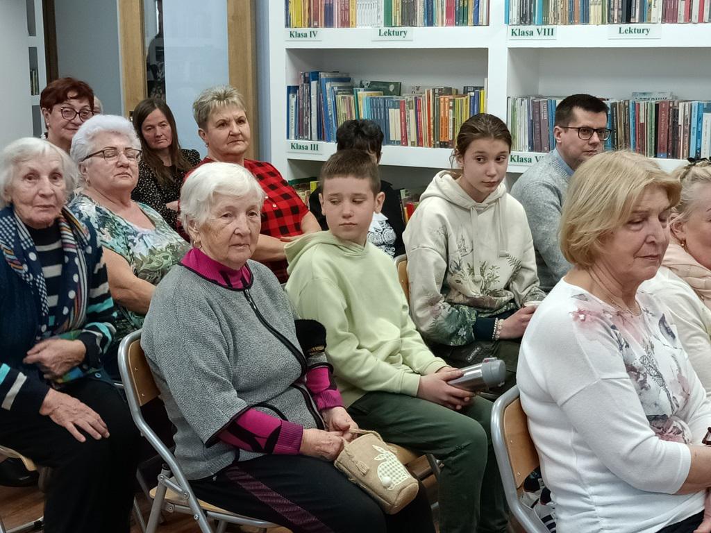 Podwieczorek przy mikrofonie prowadziła dyrektorka Biblioteki Mariola Huzar. Książkowy, pyszny tort wypiekła pani Karola, a jego sponsorem był miejscowy klub seniora. Dziękujemy!!!