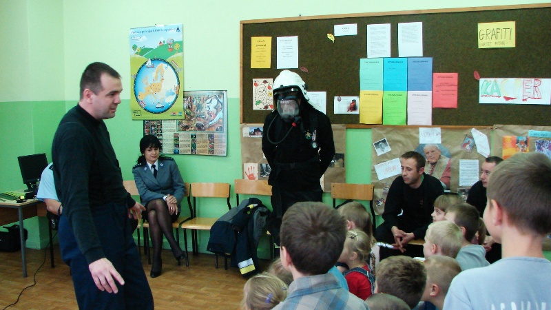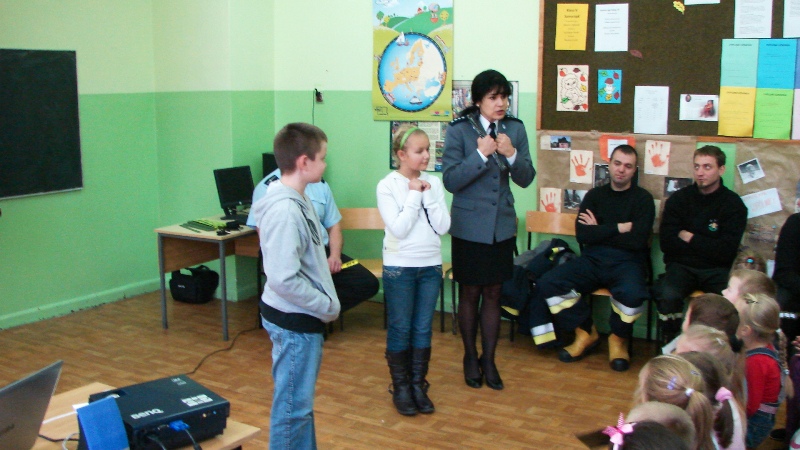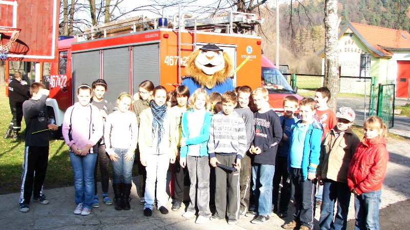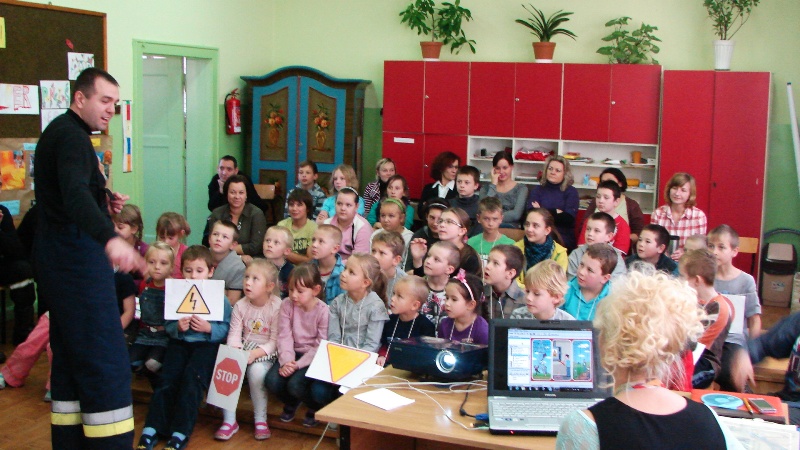 Komendant Marcin Olejnik opowiadał o swojej pracy, o tym, że straż pożarna wzywana jest nie tylko do gaszenia pożarów, ale również do wypadków drogowych, czy też udzielania pomocy ludziom np. podczas powodzi. Zapoznał dzieci ze sposobem alarmowania i wzywania pomocy. Same dzieci wykazały się sporą wiedzą na temat postępowania w razie niebezpieczeństwa. Mundurowi prostowali błędne wyobrażenia, poprawiali niewłaściwe skojarzenia i tłumaczyli, co i jak. Odbyła się także demonstracja sprzętu i ubioru strażackiego. Przymiarkom nie było końca. Następnie dzieci zostały zaproszone do zwiedzania bojowego wozu strażackiego, co było niesamowitą atrakcją dla wszystkich.