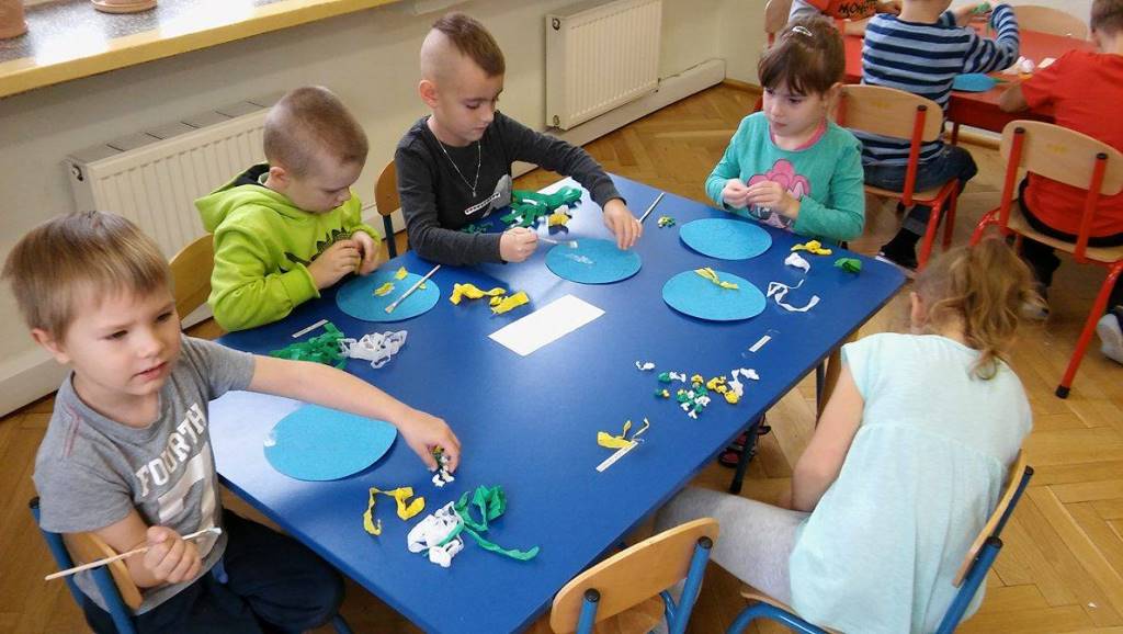Podsumowaniem zajęć była praca grupowa. Wyklejanie na planecie Ziemi konturów kontynentów kulkami w różnych kolorach, wykonanymi własnoręcznie z bibuły. Spotkanie zakończyło się kosmiczną sesją zdjęciową…
