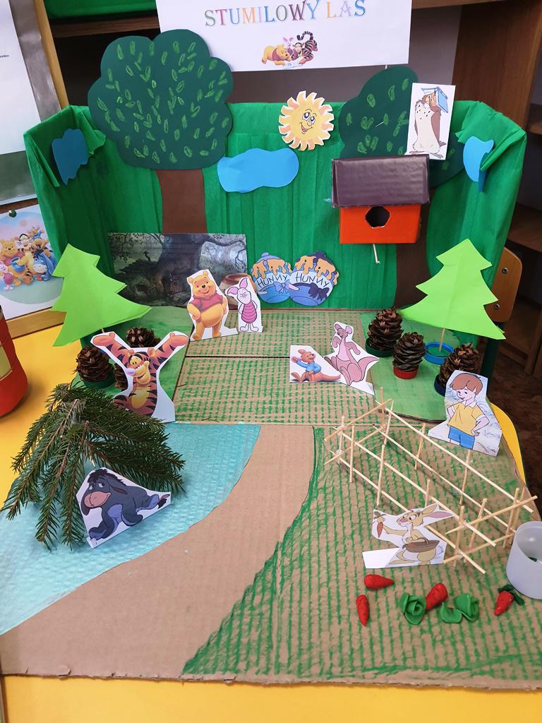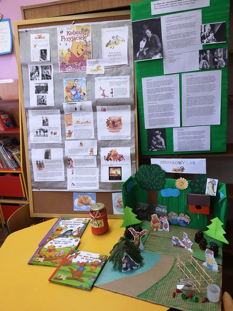 Aby ostudzić dziecięce emocje, pani bibliotekarka zaprosiła swoich gości do stworzenia własnego stumilowego lasu. W tym lesie przedszkolaki natknęły się na Kubusia Puchatka, które częstował je lizakami wprost z miodowego słoika. Było pysznie…