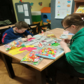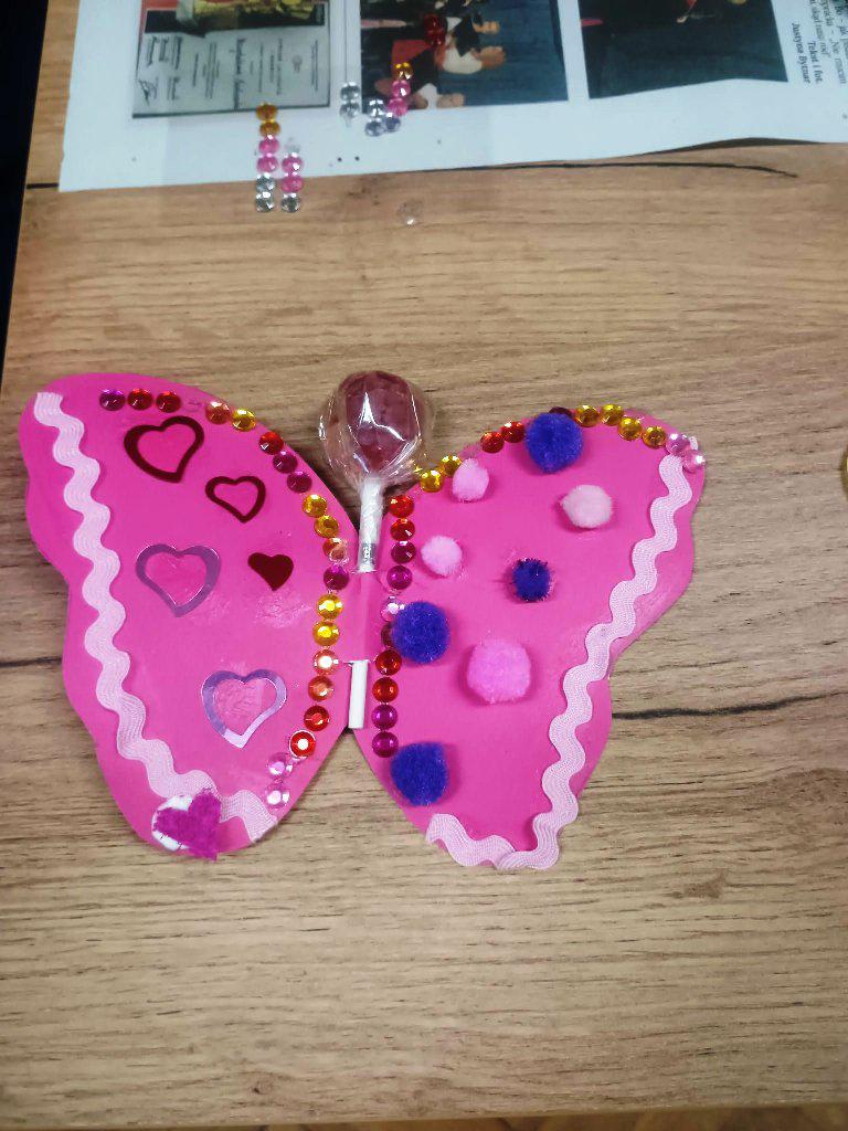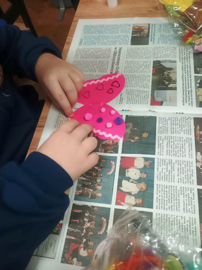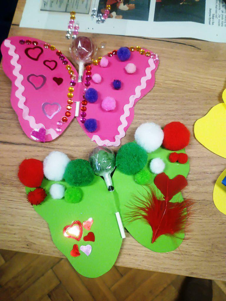 Najważniejszym punktem zajęć było tworzenie kolorowych motylków z papierowych serc oraz słodkich lizaków. Dzieci z ogromnym zaangażowaniem dobierały barwy, składały serduszka i ozdabiały swoje prace, a każdy motylek zyskał niepowtarzalny charakter. Powstały małe, walentynkowe dzieła sztuki z, których uczestnicy są dumni.