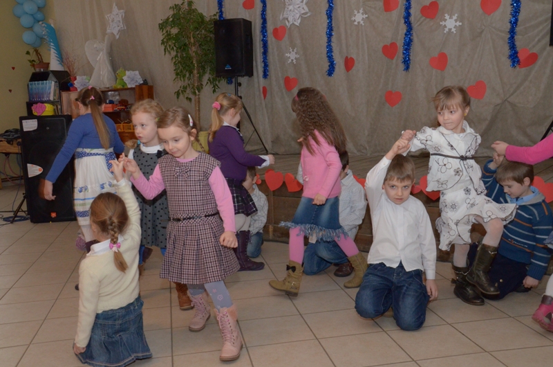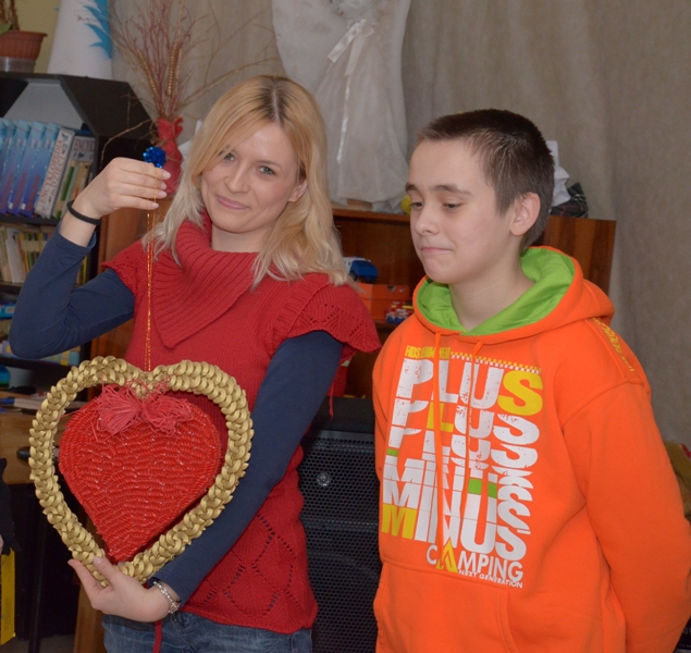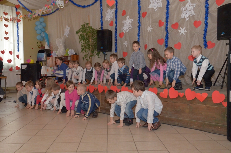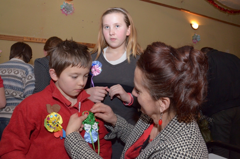 Tradycyjnie na warsztatach u pani Romy Szczerbień ścisk, tłum i wrzawa. Od kolorowych i lśniących tasiemek, ozdób i piór kręciło się w głowie. Pani Roma i dzieci wyczarowywały nadzwyczajne kotyliony walentynkowe, które znalazły się w klapach wszystkich uczestników imprezy.