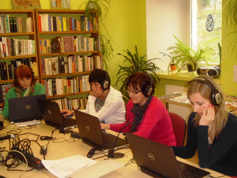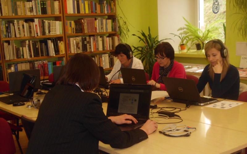 Uczestnicy kursu przychodzą do biblioteki w czasie dogodnym dla nich, ale spotykają się raz w miesiącu w sobotnie popołudnia na zajęciach grupowych. Ostatnio pod nadzorem lektora zmagali się z ćwiczeniami mającymi na celu utrwalenie wcześniej zdobytych informacji. Wszyscy nasi kursanci znają już trochę język angielski, dlatego podczas tego spotkania skupiono się na powiększaniu słownictwa i polepszaniu poprawnej wymowy.