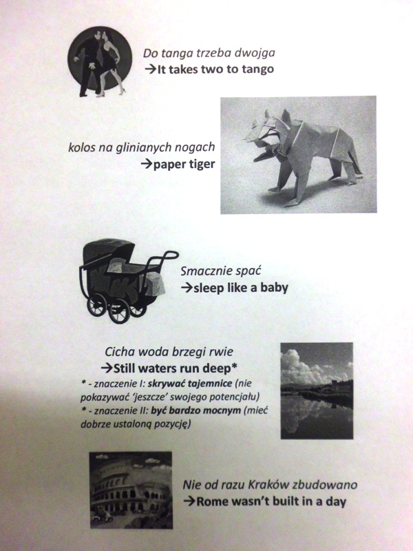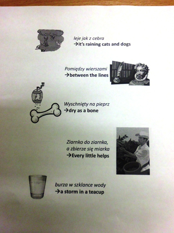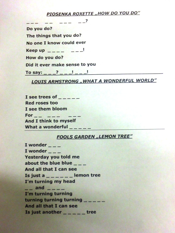 W ramach treningu posłużono się tekstami znanych piosenek takich jak piosenka Roxette „How do You do” czy L. Amstronga „What a wonderful world” nie mogło zabraknąć również deszczowej piosenki G. Kelly „Singing in the rain”. Humor dopisywał. Kursanci szlifując swoje umiejętności działali aktywnie w grupach, a efekty są zadawalające. Kolejne spotkanie w maju.