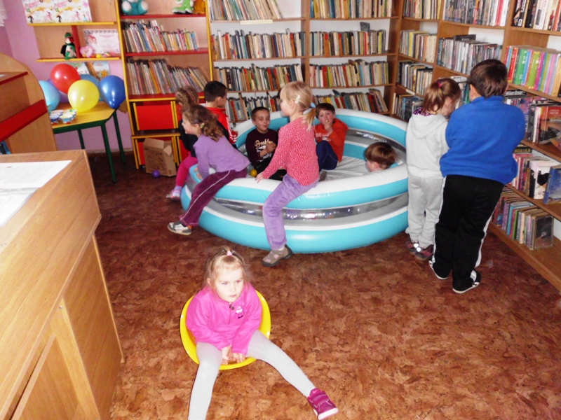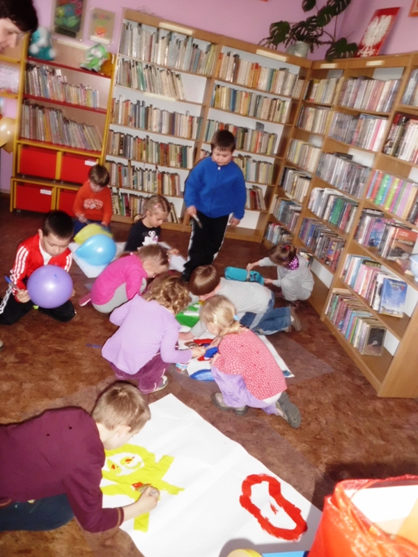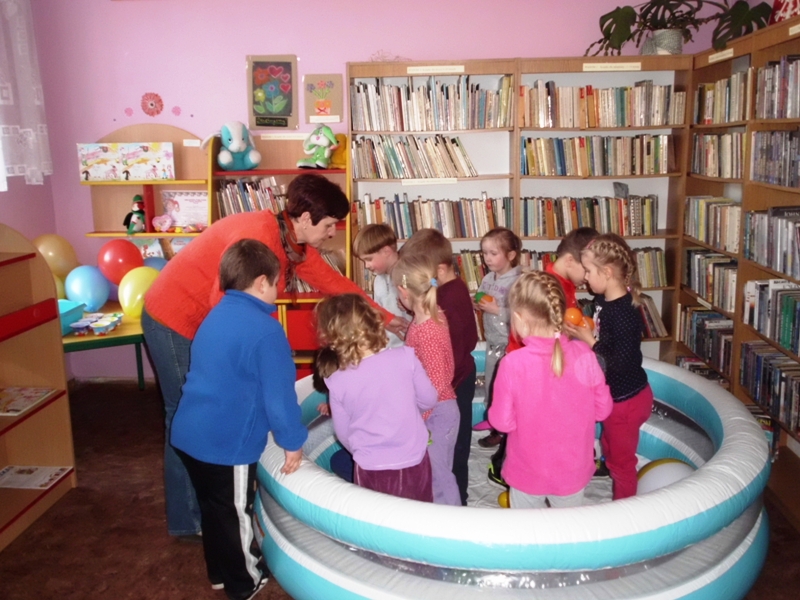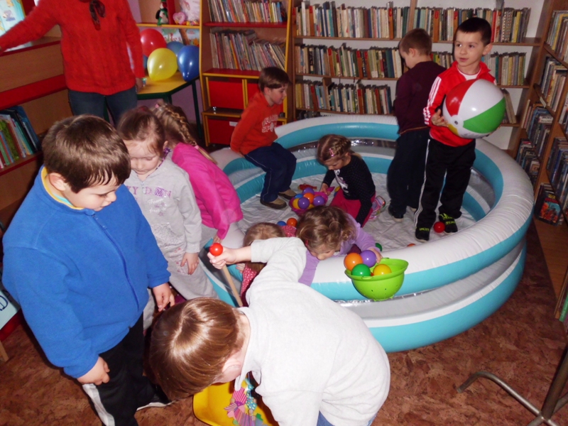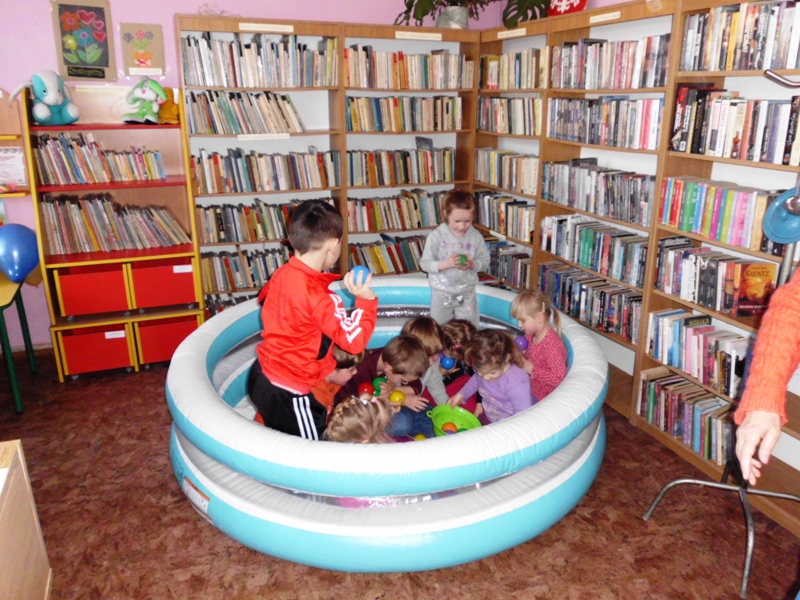 Jak na razie na warsztaty do biblioteki przychodzą dziesięcioosobowe grupy dzieci z sąsiadującego za płotem przedszkola i wcale się nie nudzą. Nasza oferta jest zdecydowanie inna, niż ta w przedszkolu, co zostało zauważone już na pierwszych zajęciach przez panią opiekunkę. W planie warsztatów są m.in.: rytualne powitania poprzez gong oddany za pomocą chochli i pokrywki z garnka przez każde dziecko, powitanie w kręgu „witaj…, jak się masz…”, zabawy edukacyjne z animatorami, mały poczęstunek, czytanie książek, swobodna zabawa w basenie bez wody, rytuał na koniec, czyli wspólne sprzątanie.