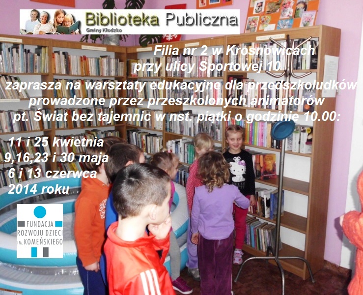 Od marca do czerwca w Filii nr 2 Biblioteki Publicznej Gminy Kłodzko w Krosnowicach realizowane są warsztaty edukacyjne dla przedszkolaków i ich opiekunów pod nazwą „Świat bez tajemnic”, w ramach tzw. grup zabawowych zainicjowanych przez Program Rozwoju Bibliotek i Fundację Rozwoju Dzieci im. Komeńskiego. Pierwsze zajęcia poprowadziła animatorka Małgorzata Ostrowska z biblioteki centralnej przy wsparciu tutejszego młodszego bibliotekarza Małgorzaty Pilipaki.