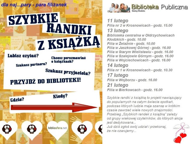 W Bibliotece Publicznej Gminy Kłodzko z okazji „Walentynek” zorganizowane zostały spotkania literackie z czytelnikami pod hasłem „Szybkie randki z książką”. Działanie było realizowane w dziesięciu bibliotekach w ramach trwałości projektu „Bajeczne Animacje Kulturalne”, który był współfinansowany ze środków Europejskiego Funduszu Rozwoju Regionalnego oraz budżetu państwa na pośrednictwem Euroregionu Glacensis w ramach Programu Operacyjnego Współpracy Transgranicznej Republika Czeska-Rzeczpospolita Polska 2007-2013 „Przekraczamy granice”.