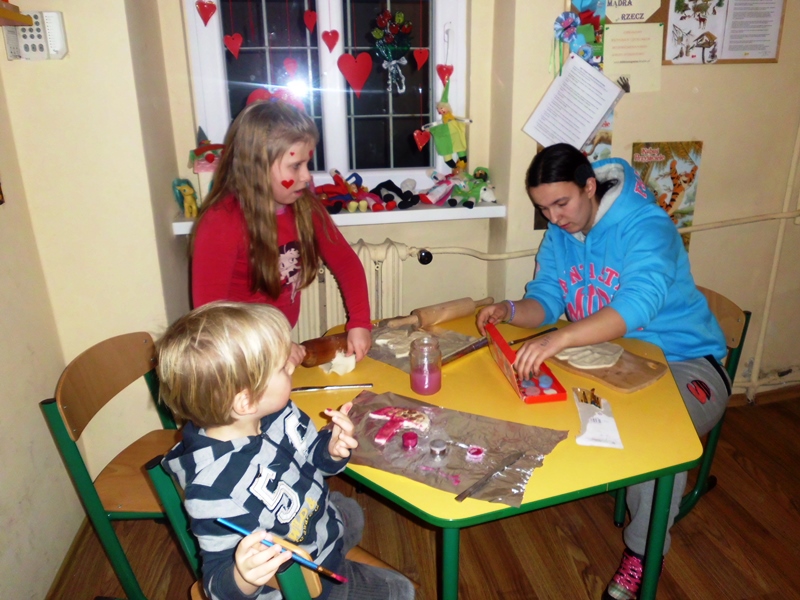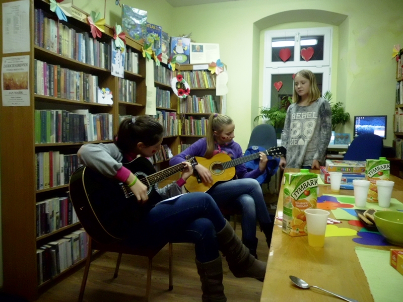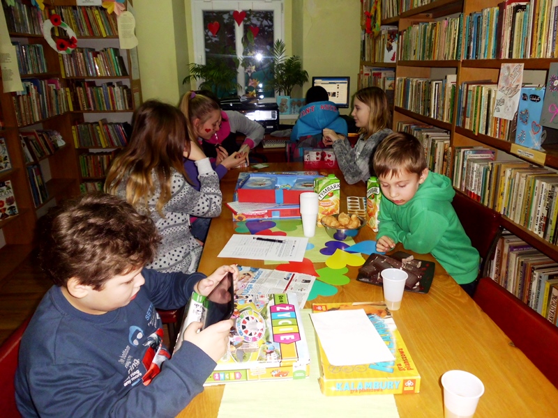 W bibliotece w Wojciechowicach było wszystkiego po troszku. Najmłodsi tworzyli serduszka z masy solnej, w której odbijali swoje małe rączki i dlatego nie zdążyli ich pomalować. Obiecują, że nadrobią . Starsi czytelnicy zajęli się kalamburami, potem przystąpili do gry „Życie” i „Kocham Cię Polsko”. Stałe bywalczynie zapewniły oprawę artystyczną spotkania, grając na gitarze w rytmie miłości i śpiewając o uczuciach do kogoś tam… Naj… parą zostali Dawid i Monika.