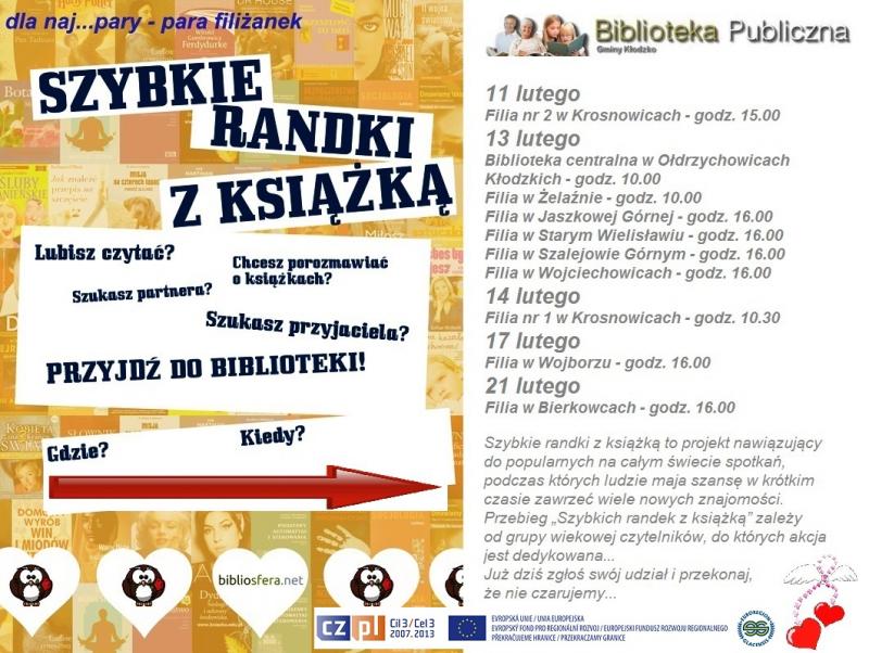 W Bibliotece Publicznej Gminy Kłodzko z okazji „Walentynek” zorganizowane zostały spotkania literackie z czytelnikami pod hasłem „Szybkie randki z książką”. Działanie było realizowane w dziesięciu bibliotekach w ramach trwałości projektu „Bajeczne Animacje Kulturalne”, który był współfinansowany ze środków Europejskiego Funduszu Rozwoju Regionalnego oraz budżetu państwa na pośrednictwem Euroregionu Glacensis w ramach Programu Operacyjnego Współpracy Transgranicznej Republika Czeska-Rzeczpospolita Polska 2007-2013 „Przekraczamy granice”.