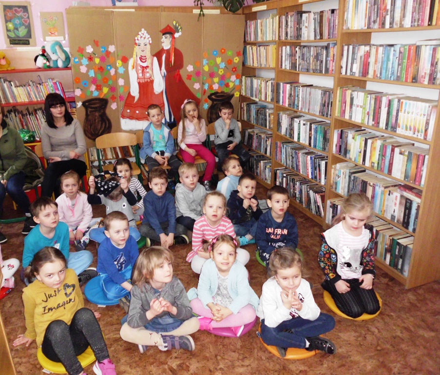 Na początek przedszkolaki szukały zwiastunów wiosny, które ukryły się za regałami. Były to kolorowe motylki, wiatraczki-kwiatki. Grzecznie wysłuchały wiersza Maminki „Suknia Pani Wiosny” oraz „Wiosny” Jana Brzechwy.