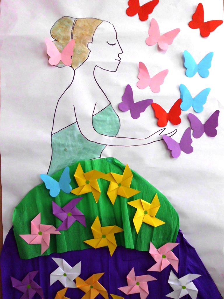 Po wysłuchaniu pięknych wierszy zaprosiły Panią Wiosnę, śpiewając wesołą piosenkę, której nauczyły się w przedszkolu. I przyszła Pani Wiosna, ale z wyglądu była jakaś taka smutna… Więc dzieci postanowiły, że ubiorą ją w motylki i kwiatki-wiatraczki.