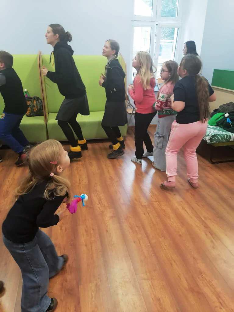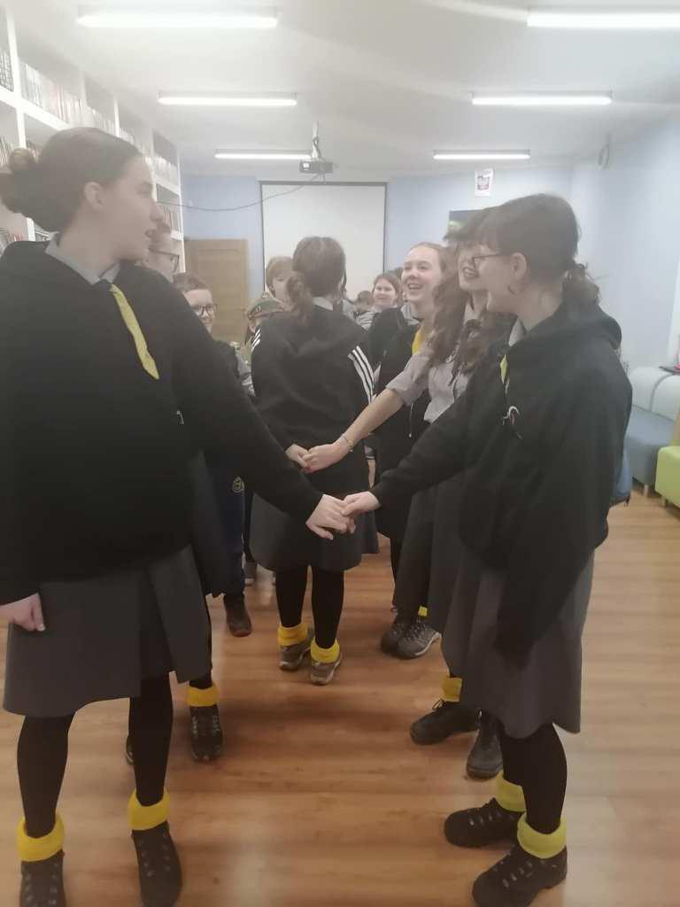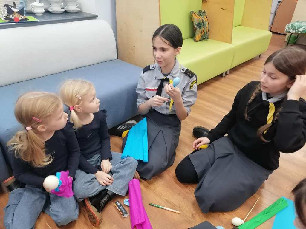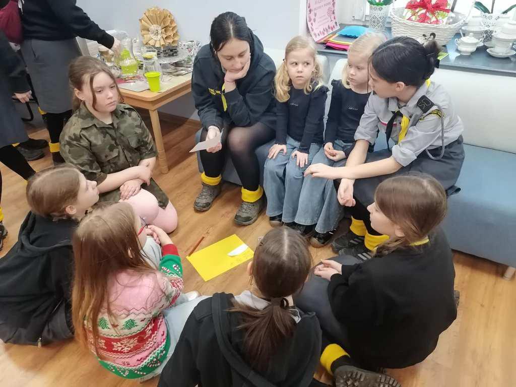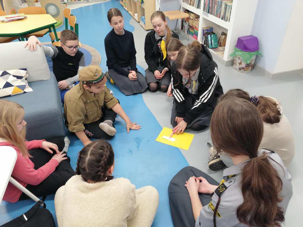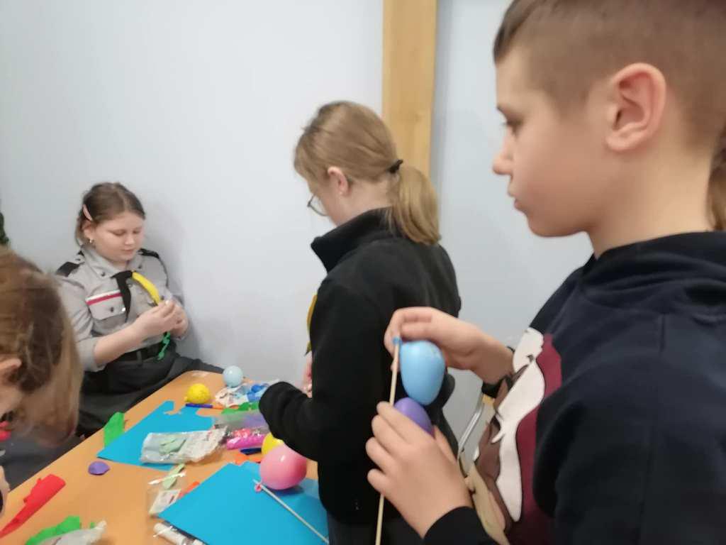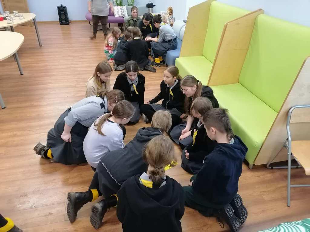 Podczas kreatywnych zajęć, 23 harcerki zintegrowały się z 12 dzieci z Wojborza. Na zapoznanie się były pląsy. Potem wszyscy pracowali się w 3 grupach. Tematem były legendy polskie.