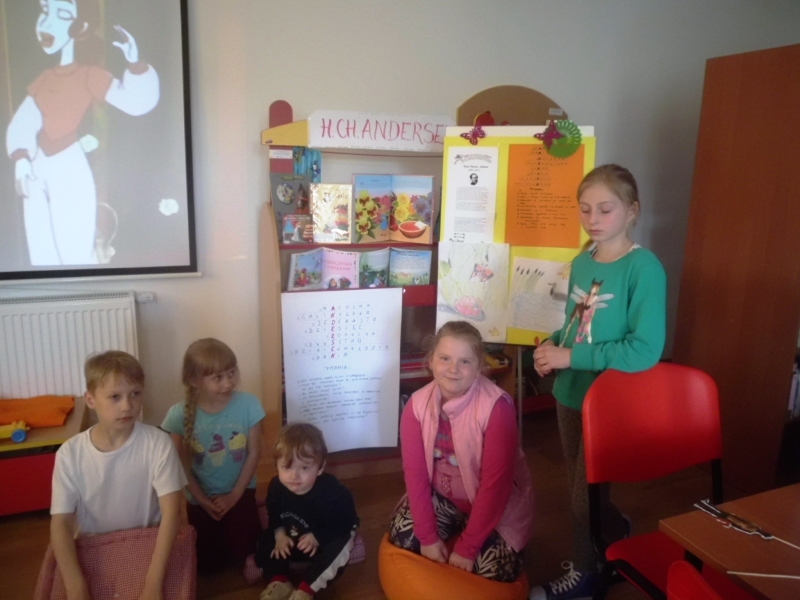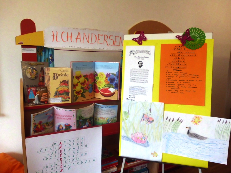 W bibliotece w Wojborzu: pani Małgosia zadbała o profesjonalną scenę z Akademii Wyobraźni i wszystkie działania nabrały profesjonalnego szlifu. Podczas zajęć poznano życie i twórczość bajkopisarza. Powstały ilustracje i portrety. Improwizowano na scenie. Wyeksponowano tematyczne książki. Nawet chłopcy wpadli do biblioteki, bo baśniowy nastrój udzielał się każdemu.