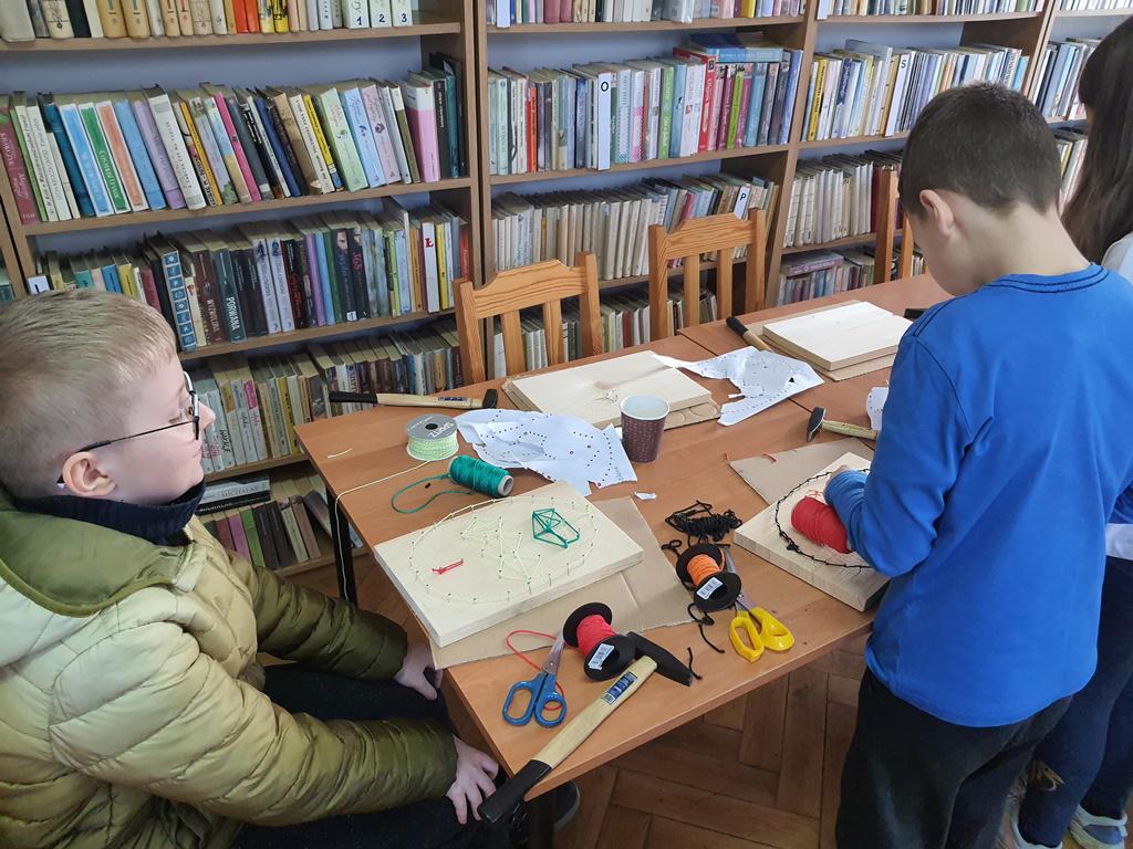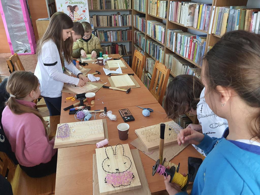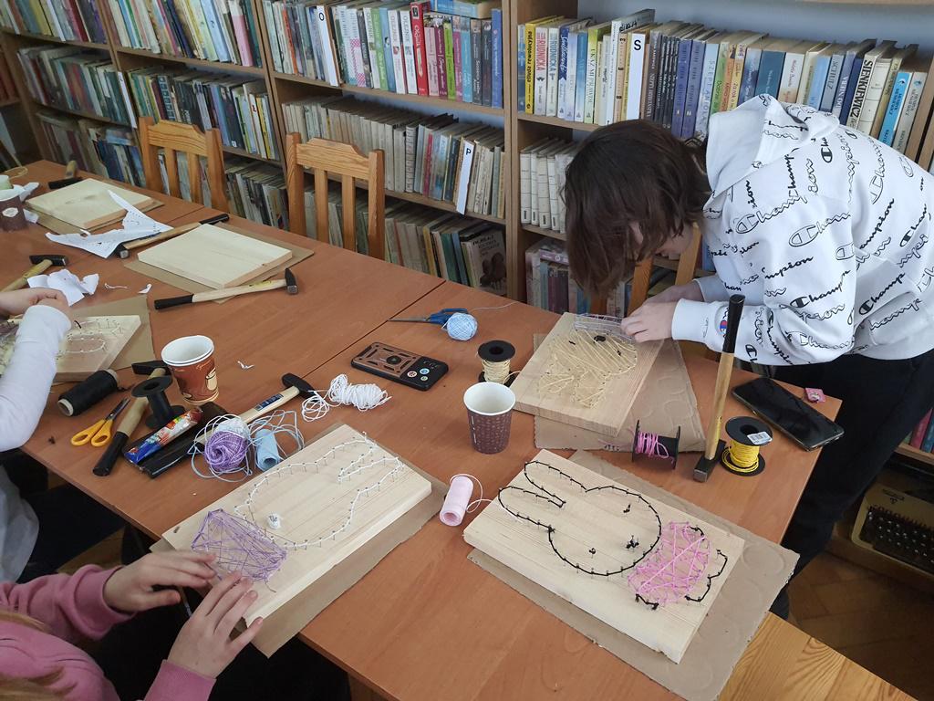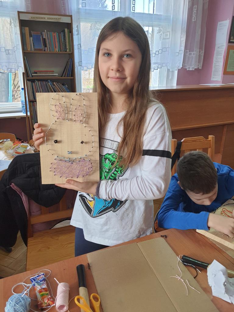 Przy tym zadaniu wyobraźnia jest kluczowa. Gdyż jest to technika polegająca na tworzeniu wzorów za pomocą naciągniętych nici lub sznurków na desce. Wszyscy młodzi czytelnicy z zapałem zajęli się tworzeniem uroczych wielkanocnych zajączków i pisanek, korzystając z tej fascynującej techniki.