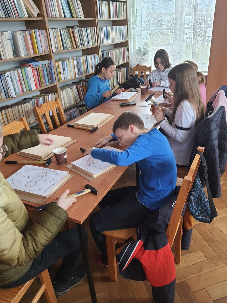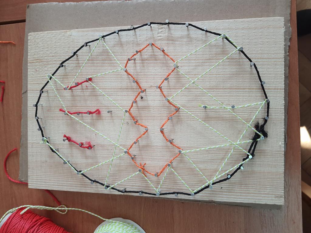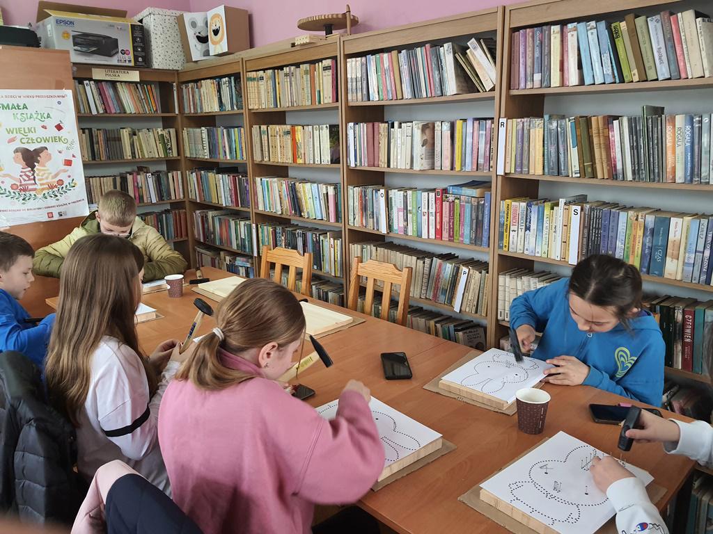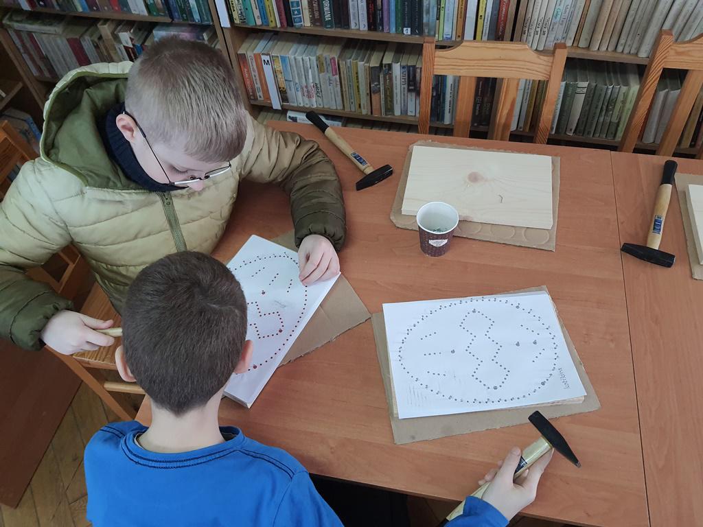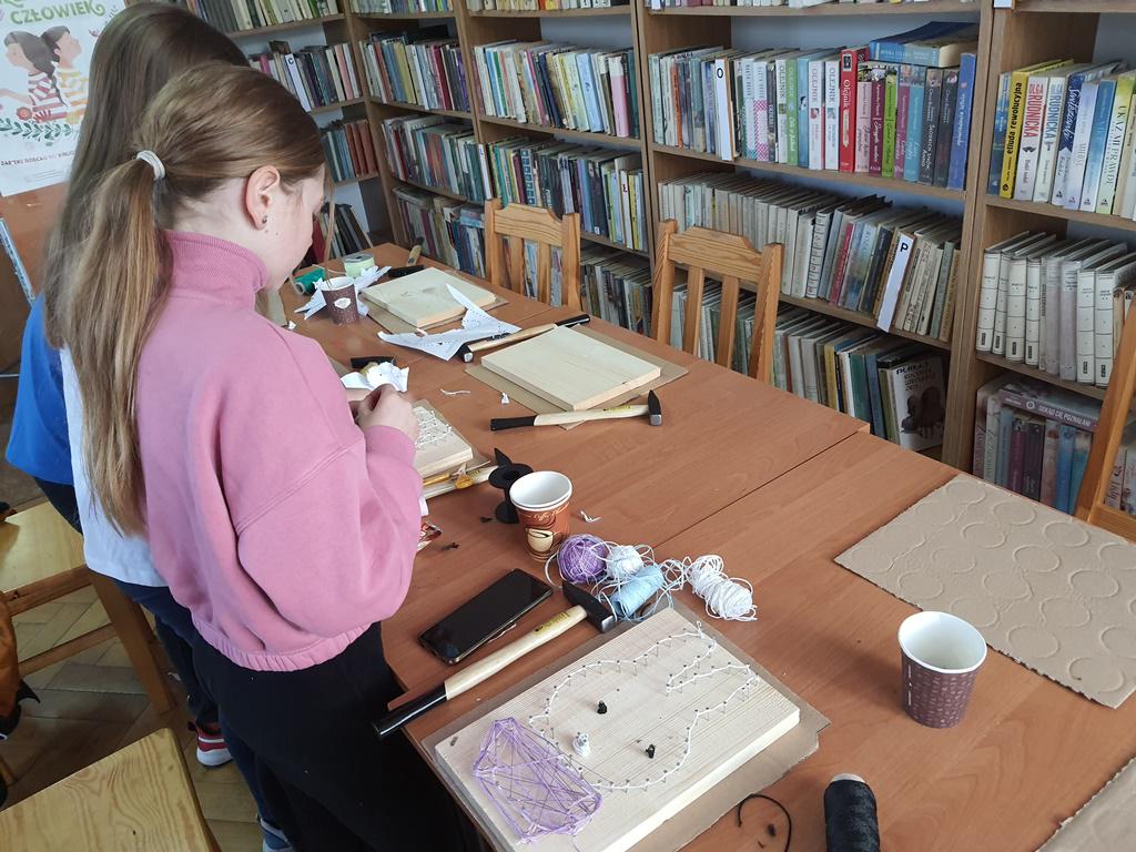 Przy tym zadaniu wyobraźnia jest kluczowa. Gdyż jest to technika polegająca na tworzeniu wzorów za pomocą naciągniętych nici lub sznurków na desce. Wszyscy młodzi czytelnicy z zapałem zajęli się tworzeniem uroczych wielkanocnych zajączków i pisanek, korzystając z tej fascynującej techniki.