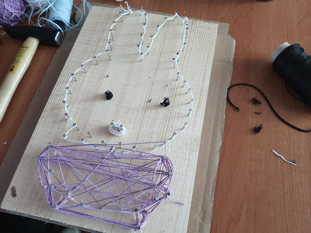 Jak twierdzą uczestnicy, najtrudniejszym zadaniem było wbijanie gwoździ w deskę aby utworzyć wzór. Następnie przeszliśmy do zawijania sznurków. W obu przypadkach każdy miał inną technikę – jedni wbijali więcej gwoździ inni mniej, jedni zaplatali króliki w jednym kolorze, a inni tworzyli różnokolorowe postacie. Każdy miał swój własny pomysł na królika i pisankę, dzięki czemu prace były niepowtarzalne i wyjątkowe.
