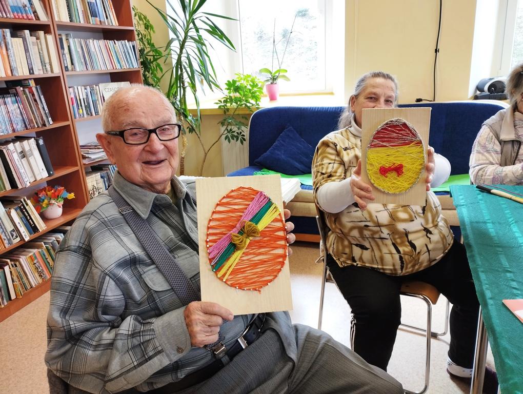 Tematem warsztatów techniką string.art. była Wielkanoc. Na deseczki trafiły wzory pisanek i zajączków. Stukanie wbijanych gwoździ słychać było w całym budynku, a nawet na zewnątrz.