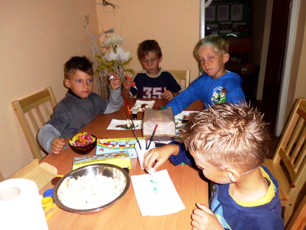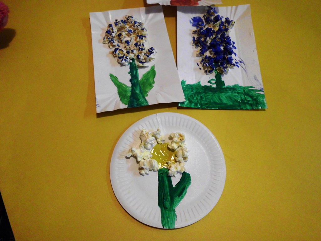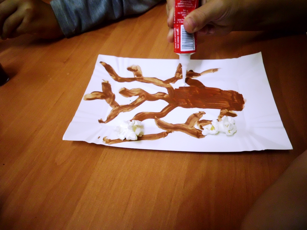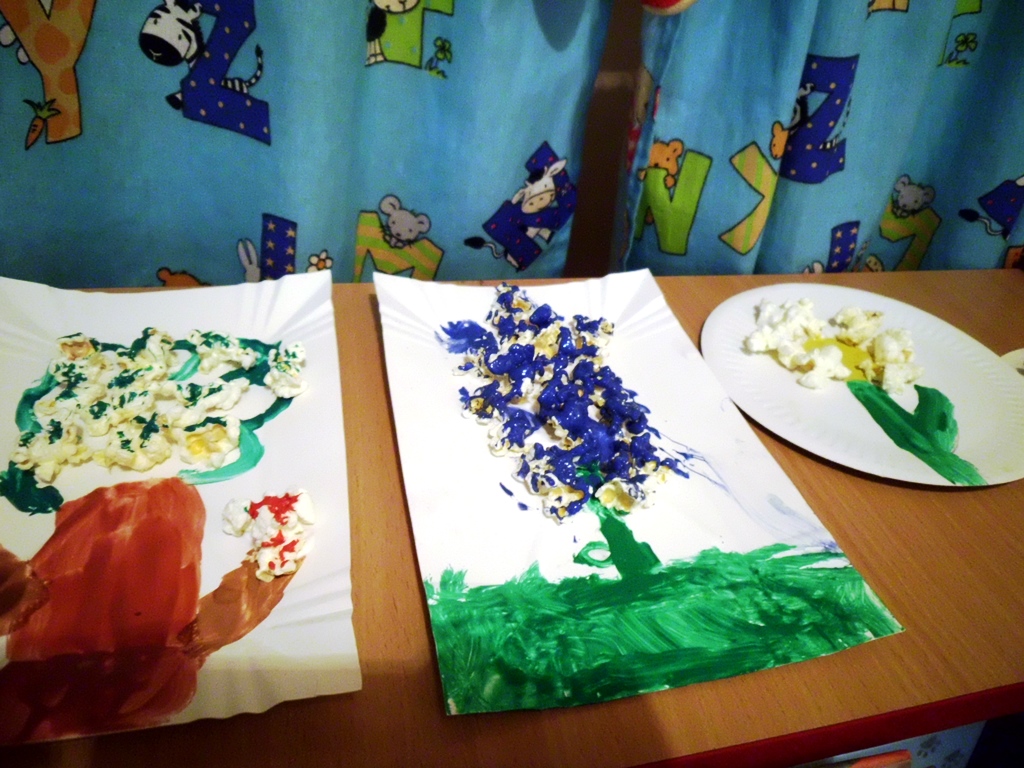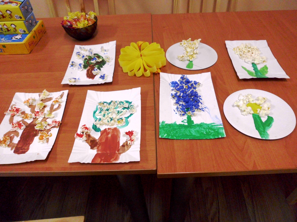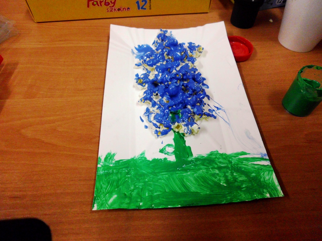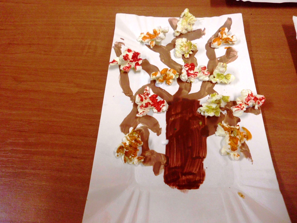 Porady: popcorn można kupić gotowy lub zrobić samodzielnie, ale najlepiej bez tłuszczu, będzie się lepiej przyklejał. Najpierw dzieci rysują i wycinają liście zginając je wzdłuż na pół. Liście przyklejamy do gałązek, tak aby fragmentami odstawały od kartki tworząc przestrzenną pracę plastyczną. Można też do wszystkich elementów zastosować prażone ziarna kukurydzy, wspomagając się tylko kolorowymi farbami – tak, jak dzieci w Wojciechowicach. To była oferta dla dzieci.