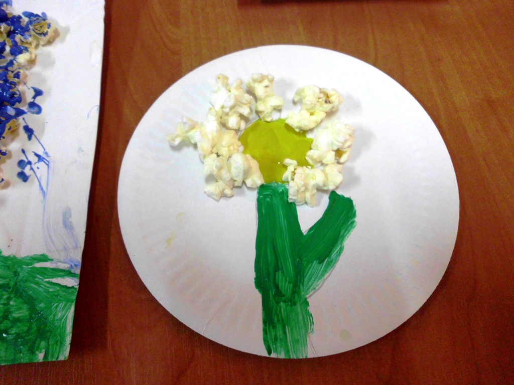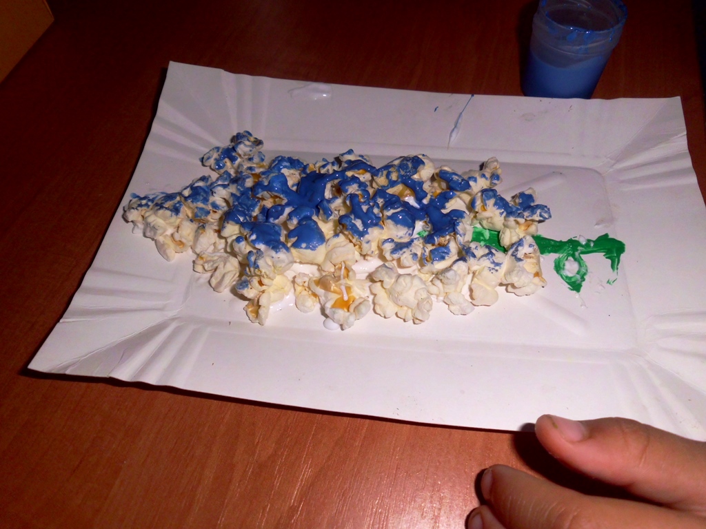 Przepis na udany popcorn w 3D: do jego wykonania potrzebujemy kartkę A4 najlepiej techniczną, klej wikol lub magic, pędzle, farby, zielony papier lub bibułę na liście i popcorn.