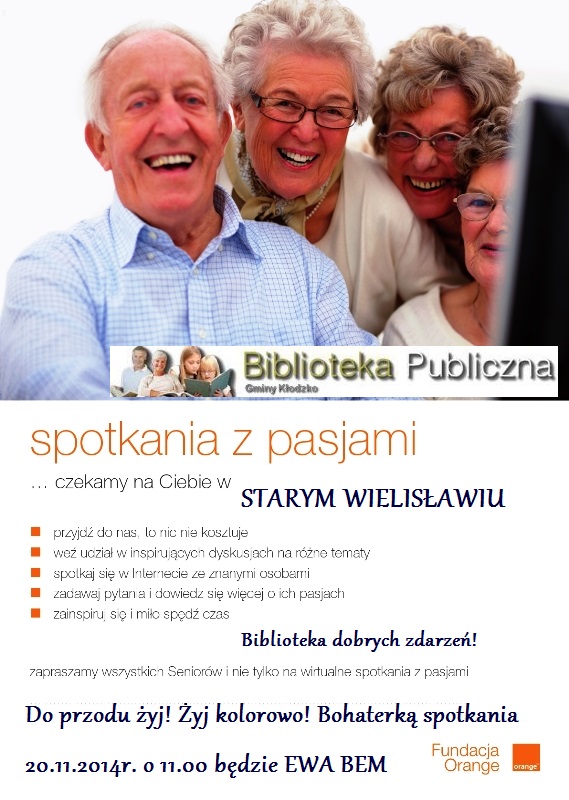 Wideokonferencja na żywo z piosenkarką Ewą Bem, 20 listopada 2014r. do biblioteki w Starym Wielisławiu przyciągnęła dziewięć osób. Artystka opowiadała o zainteresowaniach, o tym czym jest dla niej szczęście i za co ceni ludzi. Działanie to realizuje Biblioteka Publiczna Gminy Kłodzko w ramach drugiej edycji projektu Fundacji Orange „Spotkania z pasjami”