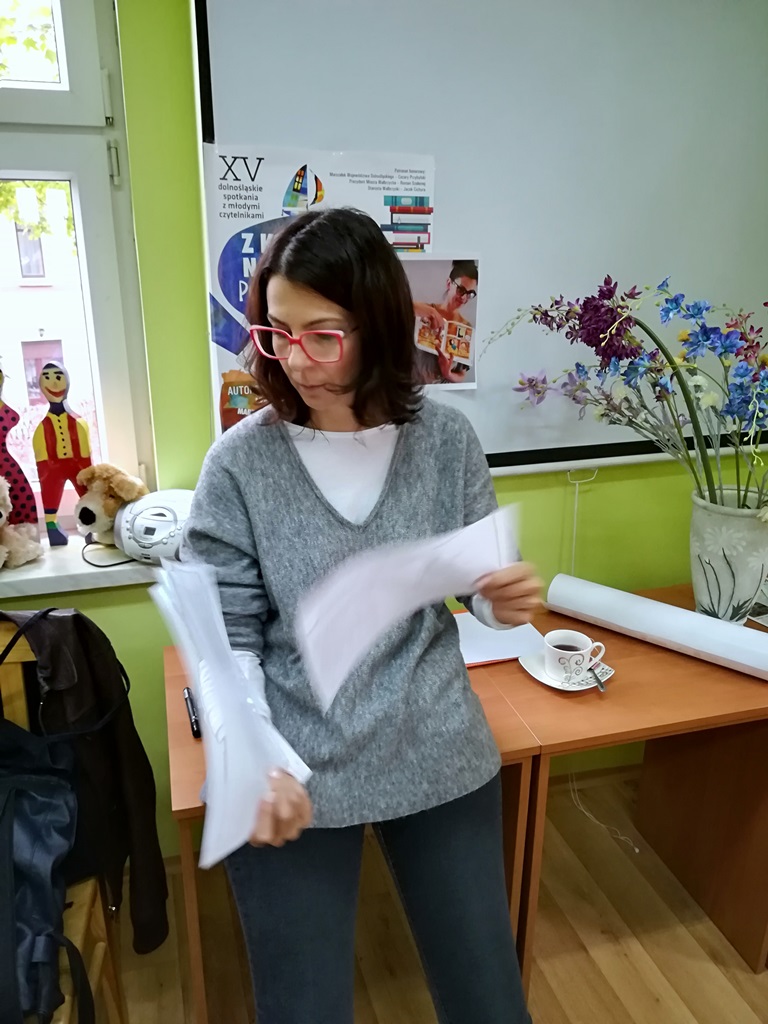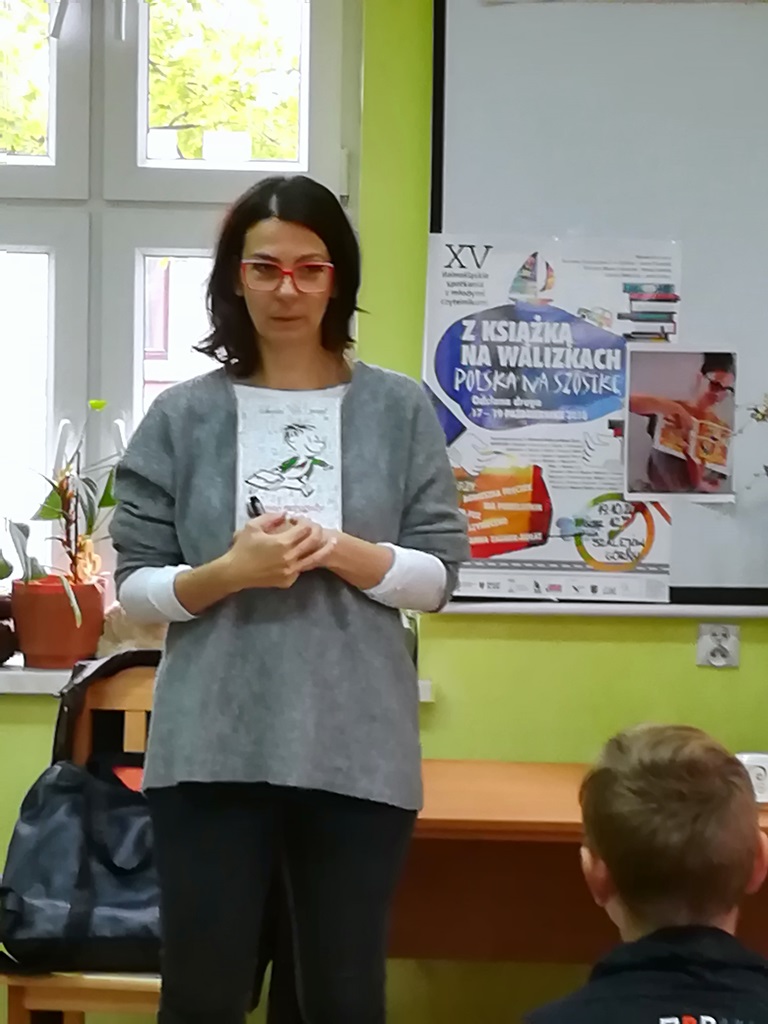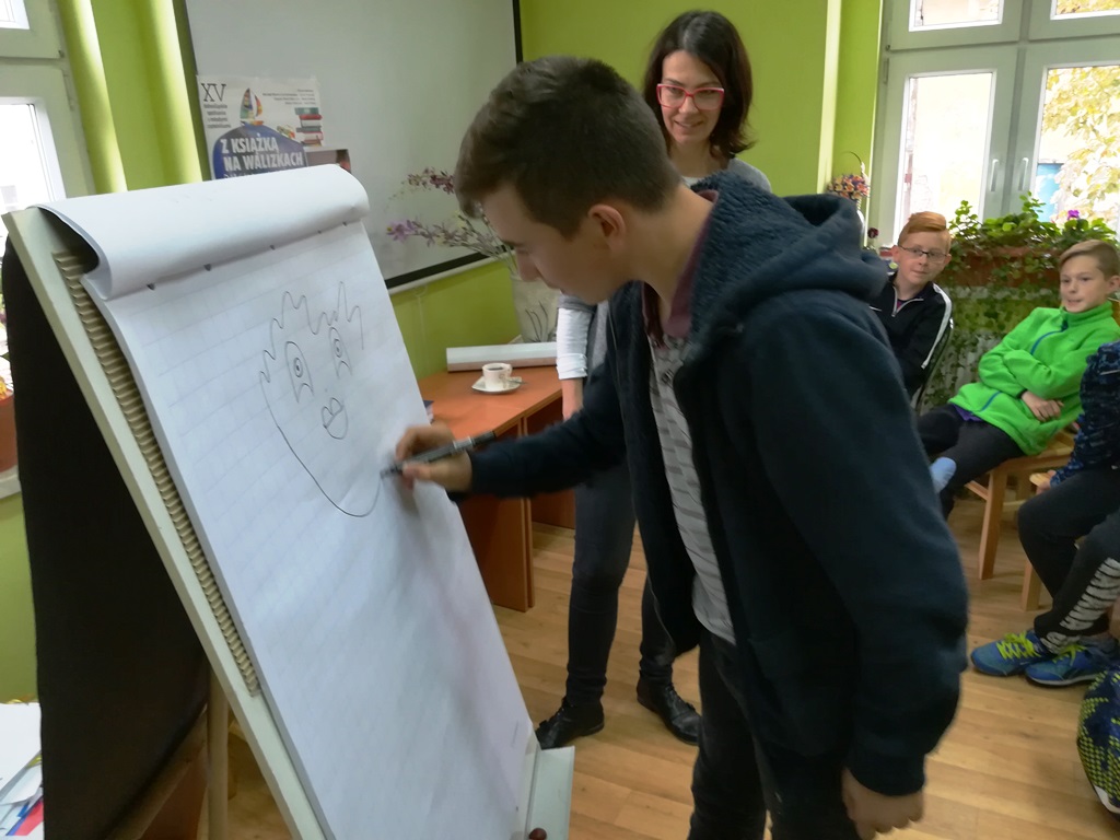 Osobowość ilustratorki jest niesamowita… Od samego wejścia zauroczyła wszystkich chłopców i nauczycieli. Dyrektor Biblioteki Mariola Huzar nie odrywała wzroku od tego wszystkiego, co zaprezentowała sobą Joanna Zagner-Kołat. Pani radna i sołtys Teresa Biel-Lutosławska nie nadążała z fotkami, bo tempo było zaiste wielkie… Bibliotekarka Monika Fedak była czujna jak pogotowie ratunkowe… Uczniowie miejscowej Szkoły Integracyjnej mieli ciągle pytania…które zahaczały nie tylko o sferę zawodową, ale również prywatną i inne zainteresowania.