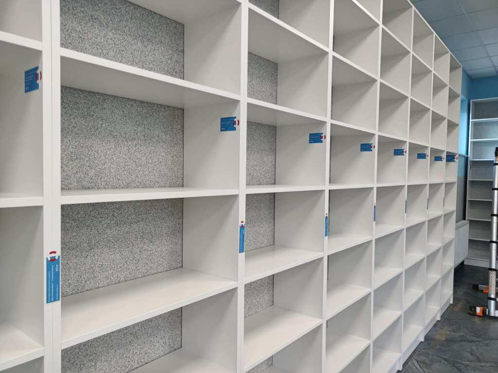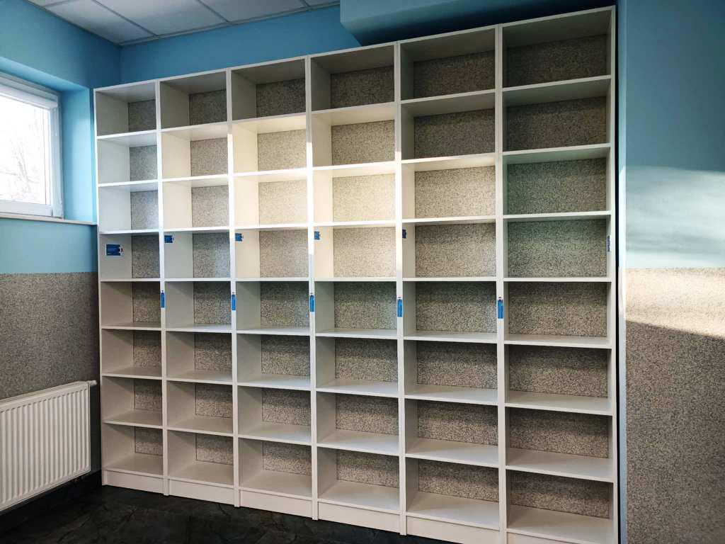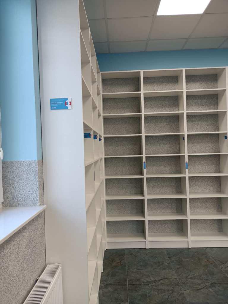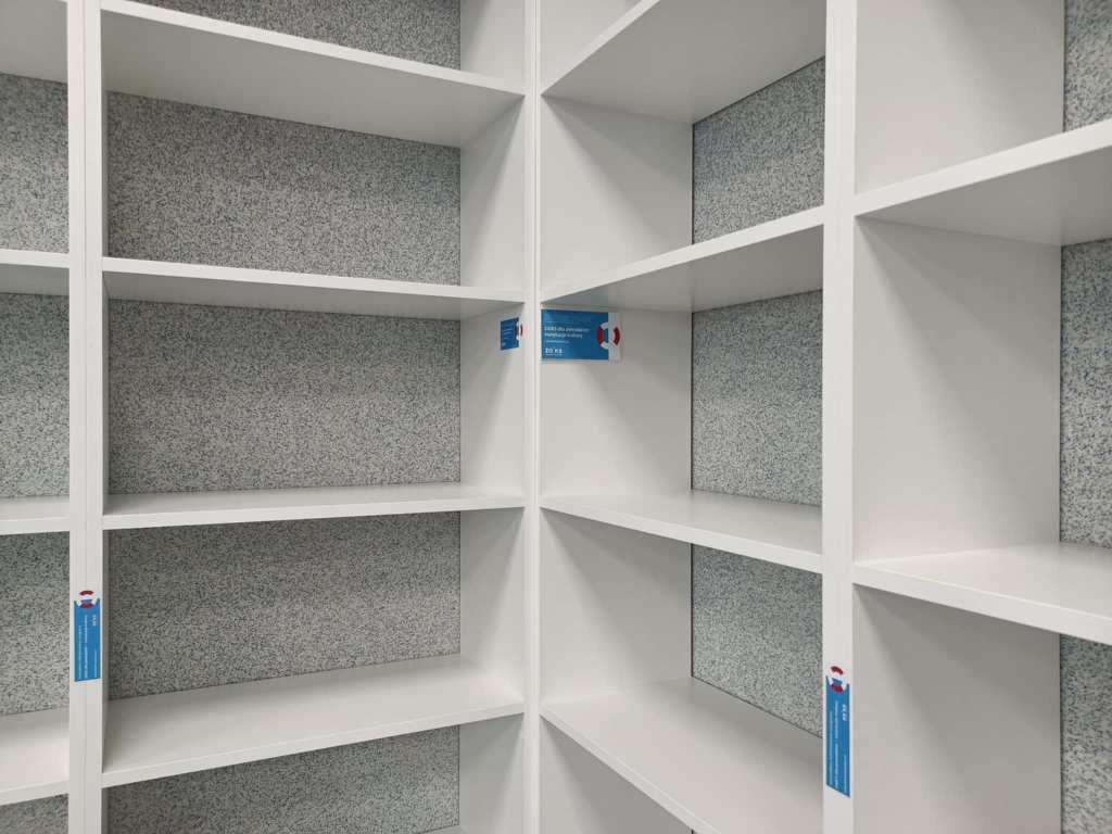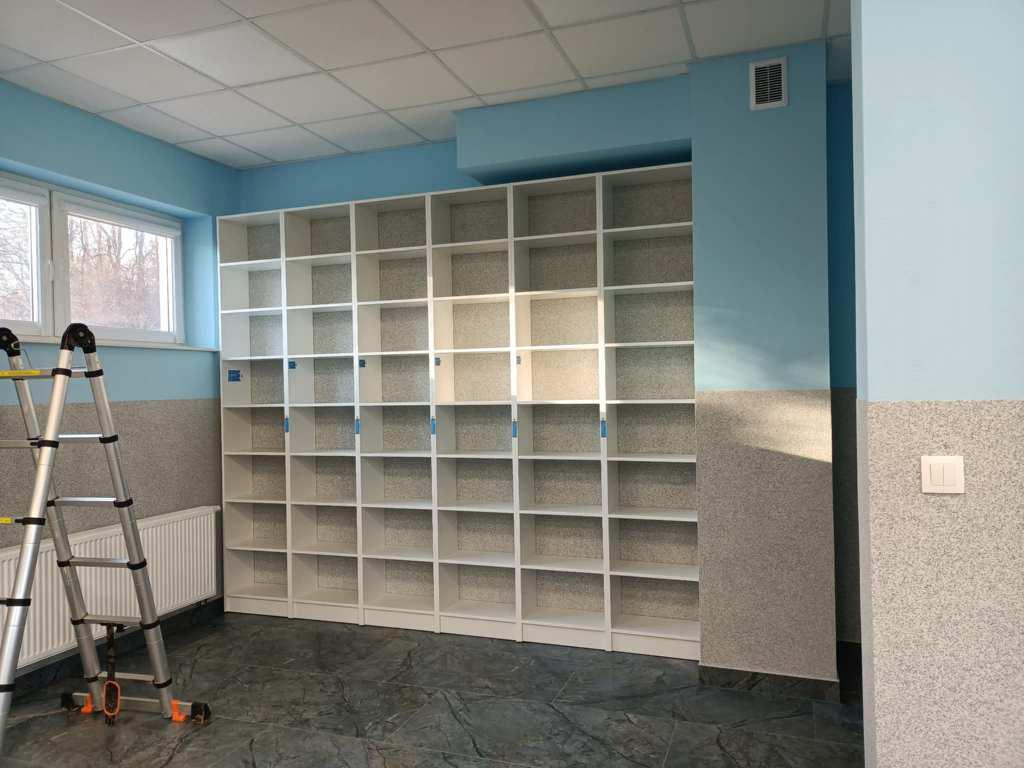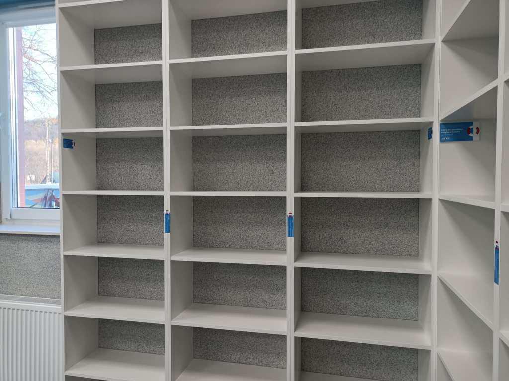Regały zostały zaprojektowane tak, aby maksymalnie wykorzystać przestrzeń i zapewnić łatwy dostęp do księgozbioru. Ich jasna kolorystyka i ergonomiczna konstrukcja nadały wnętrzu świeżości, a jednocześnie podkreśliły nowy początek po trudnym doświadczeniu.