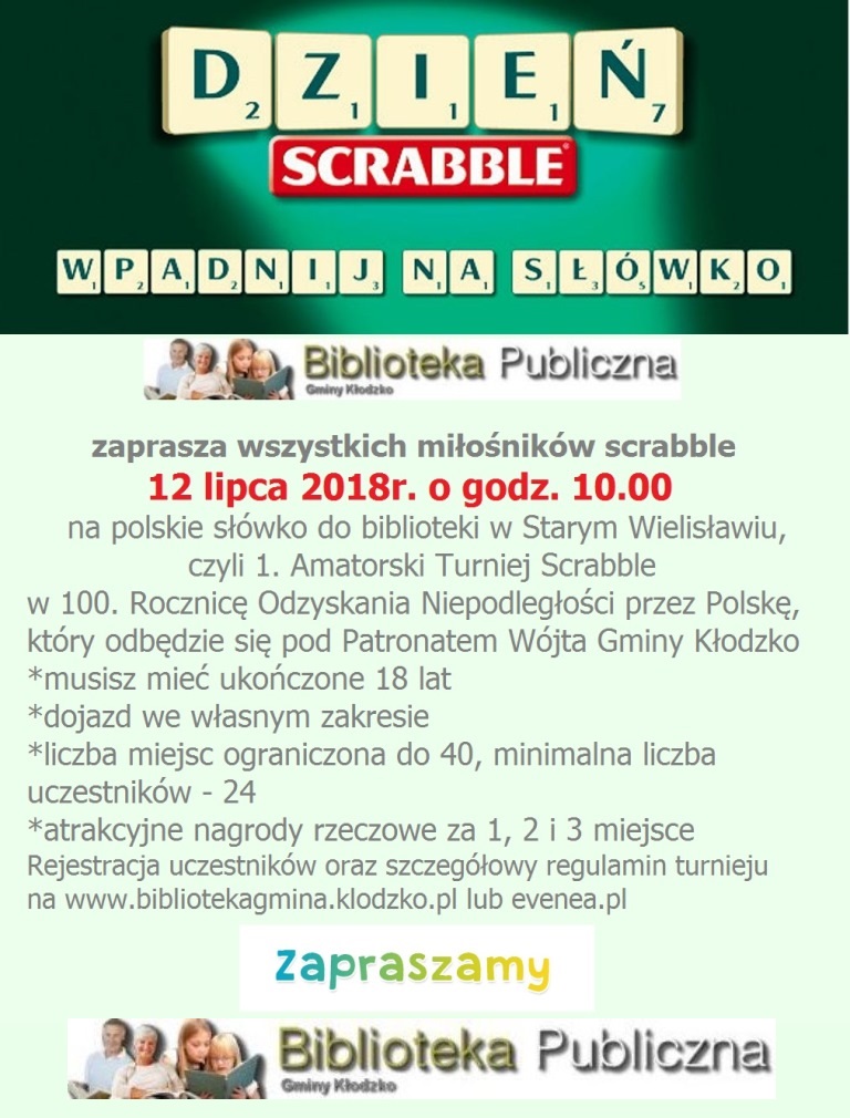 4.Przed rozpoczęciem rozgrywek uczestnicy zapoznają się ze szczegółowym regulaminem gry w scrabble, który jest też dostępny na stronie www.bibliotekagmina.klodzko.pl, będzie również dostępny na miejscu imprezy.