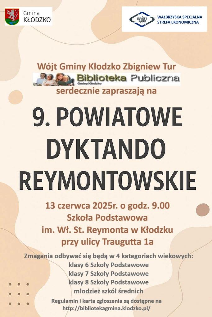 W imieniu Wójta Gminy Kłodzko Zbigniewa Tura oraz swoim własnym serdecznie zapraszam uczniów klas 6-8 oraz młodzież szkół średnich do udziału w 9. edycji Powiatowego Dyktanda o tytuł "Mistrza Ortografii 2025". Wydarzenie jest współfinansowane przez Wałbrzyską Specjalną Strefę Ekonomiczną INVEST-PARK, która zadbała również o przygotowanie uczniów do pisania dyktanda. 29 maja o godz. 10.30 w Szkole Podstawowej im. Wł. St. Reymonta w Kłodzku (ulica Traugutta 1a) będą miały miejsce warsztaty literacko-plastyczne z pisarką Agnieszką Urbańską. Proszę o zgłaszanie liczby uczniów na maila dyrektor.bpgk@gmail.com najpóźniej do dnia 27 maja.