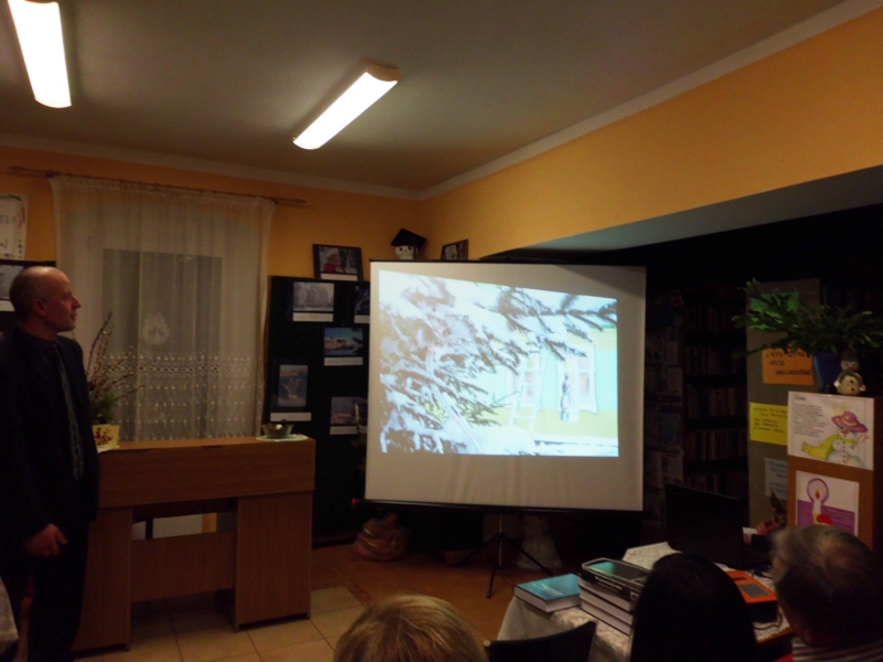Gospodyni wystawy, bibliotekarz Stanisława Wyspiańska Skawina zadbała o odpowiednią wizualizację prac, oprawę i gości. Pytaniom nie było końca, a pani Stanisława na co dzień opowiadała czytelnikom o tym wszystkim, co autor miał na myśli.