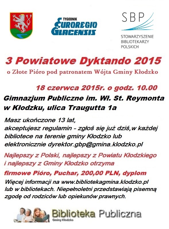 49 osób z województwa dolnośląskiego, lubuskiego, łódzkiego i małopolskiego pisało 18 czerwca w Gimnazjum Publicznym im. Wł. St. Reymonta w Kłodzku , 3 Powiatowe Dyktando Stowarzyszenia Bibliotekarzy Polskich, o Złote Pióro, pod Honorowym Patronatem Wójta Gminy Kłodzko. Choć najwięcej było młodzieży, to swoje umiejętności postanowili sprawdzić również dorośli. Najmłodszy uczestnik liczył 13 lat, a najstarszy 62.