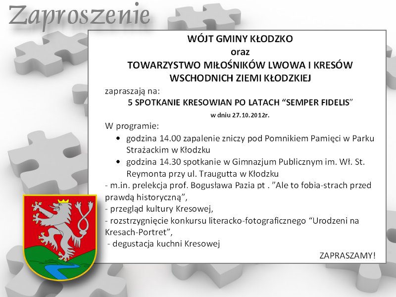 27 października w zimowej szacie pod Pomnikiem Pamięci Pomordowanych Polaków na Kresach II RP w Parku Strażackim w Kłodzku rozpoczęto 5 Kłodzkie Spotkanie Kresowian. Okolicznościowe słowo wygłosił Ks. Bolesław Stanisławiszyn z Parafii Żelazno. Wiele już rocznic minęło, bo czas w miejscu nie stoi. Że pamięć o Kresach zaginie, tego z nas nikt się już nie boi…