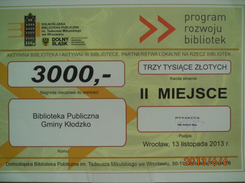 Laureatką konkursu 2013 została Gminna Biblioteka Publiczna Gminy Oława, która otrzymała nagrodę rzeczową do wartości 5.000 złotych. W imieniu biblioteki nagrodę odebrała dyrektor GBP Halina Sinkiewicz. Bibliotekarki ze zwycięskiej placówki, w osobach Anety Zygmunt i Małgorzaty Teuchmann, zaprezentowały uczestnikom konferencji działanie Nasze miejsce. Opowiedziały o pomyśle na powstanie projektu, o jego realizacji we wszystkich placówkach bibliotecznych na terenie gminy, partnerach w działaniach oraz korzyściach, jakie projekt przyniósł zarówno bibliotece, jak i lokalnym społecznościom. Miejsce drugie i nagroda rzeczowa do wartości 3.000 złotych za projekt Bajeczne animacje kulturalne przypadły Bibliotece Publicznej Gminy Kłodzko. Nagrodę odebrała Mariola Huzar, dyrektor placówki. Miejsce trzecie zaś przyznano Bibliotece Publicznej Miasta i Gminy w Twardogórze, za działanie pn. Kościół pod wezwaniem św. Trójcy i Matki Boskiej jako przestrzeń bibliotecznych wystaw i akcji w latach 2012 – 2013. Nagrodę rzeczową do wartości 2.000 złotych odebrała kierująca placówką Beata Pięta. Wszystkim laureatom konkursu jeszcze raz gratulujemy!
